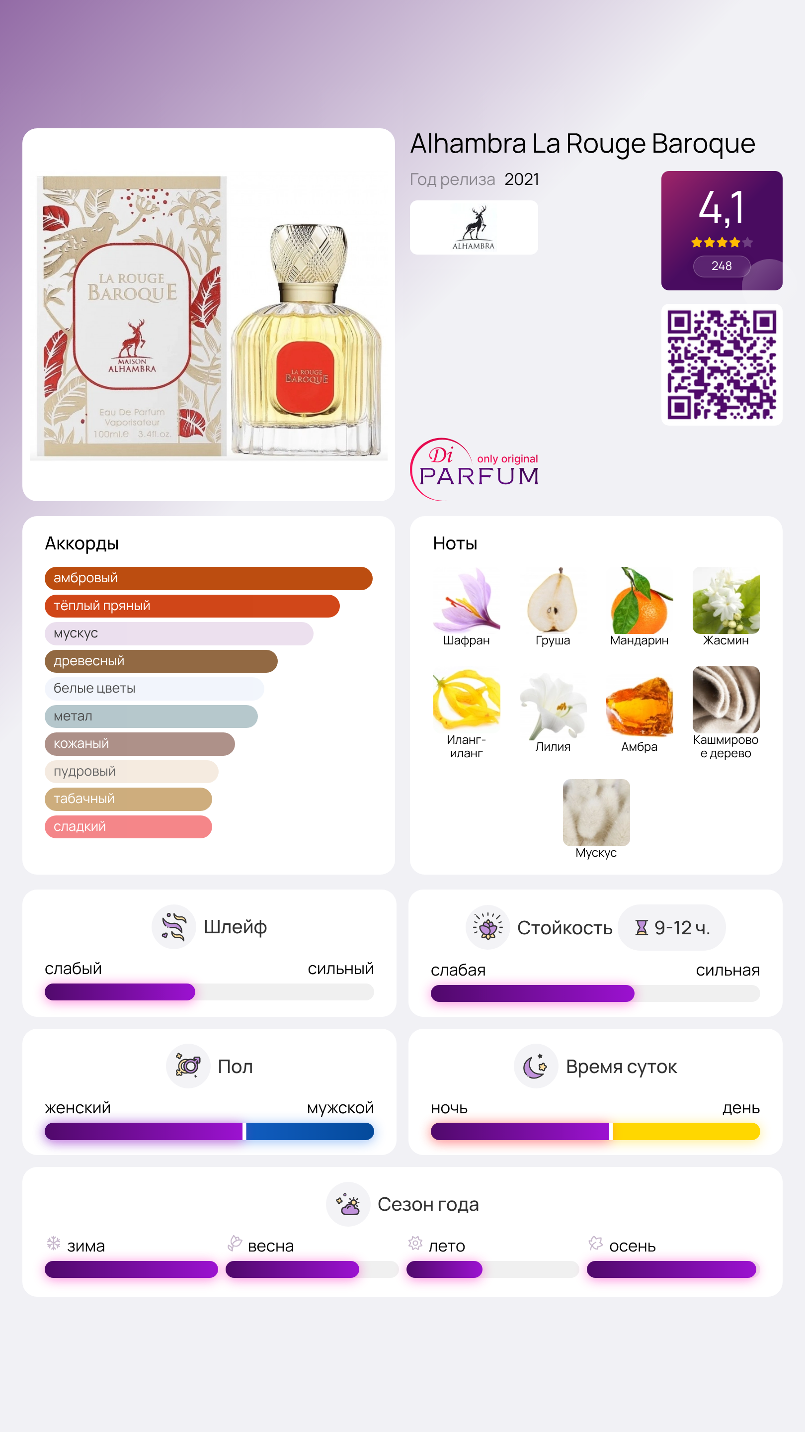Baroque Rouge 540 от Maison Alhambra – это восточный аромат, предназначенный как для женщин, так и для мужчин. Запущенный в 2021 году, он быстро завоевал популярность благодаря своему уникальному сочетанию нот. В верхних нотах вы ощутите нежные акценты шафрана, груши и мандарина, создающие яркое и свежое первое впечатление.