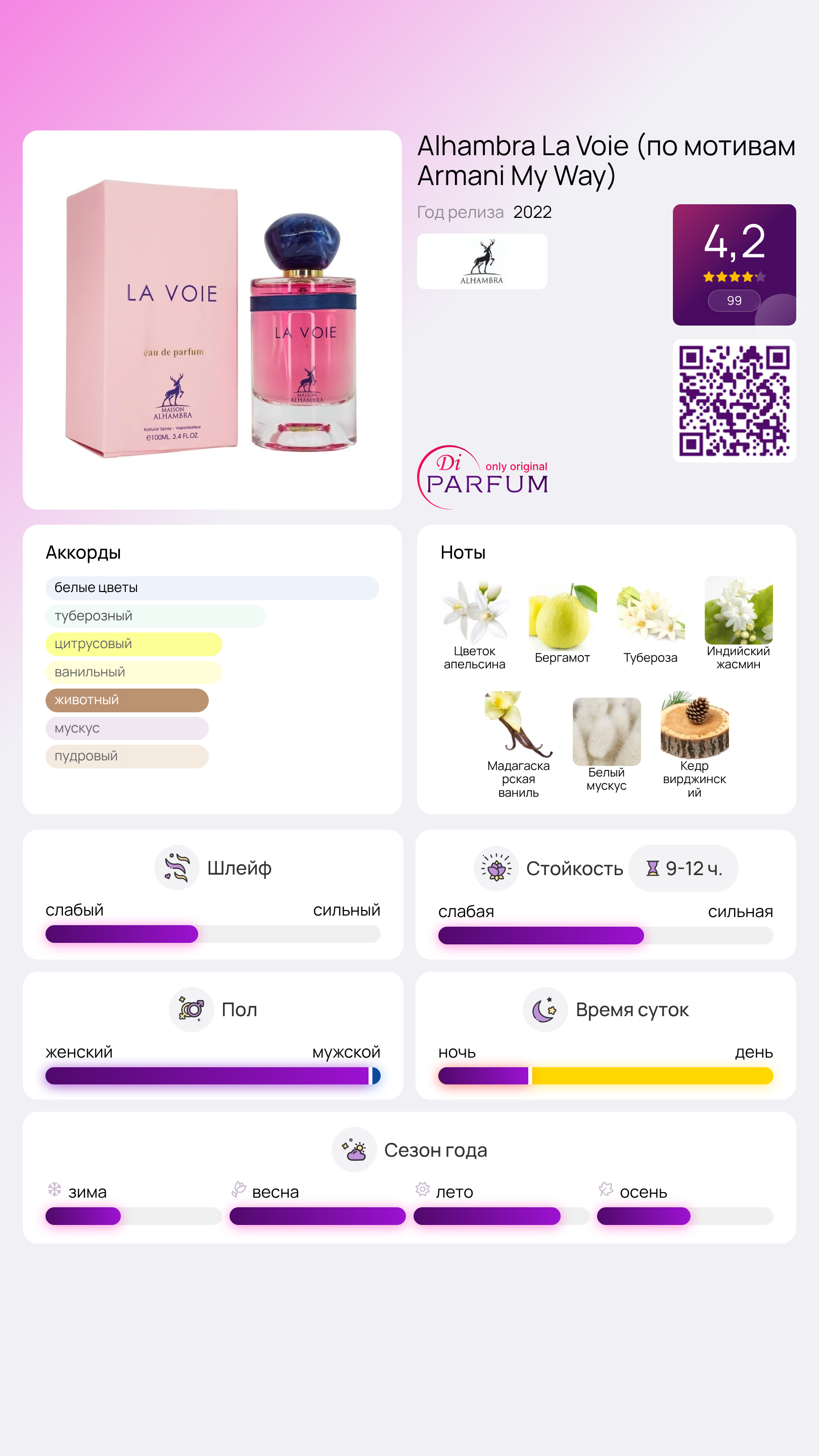Парфюм Alhambra La Voie, вдохновленный ароматом Armani My Way, предлагает уникальную интерпретацию, которая понравится многим любительницам оригинала. В арабской версии название переводится как «путь», символизируя путь каждой женщины к самопознанию и стремлению к самосовершенствованию. Каждая сможет найти в этом аромате нечто близкое и созвучное своей душе.