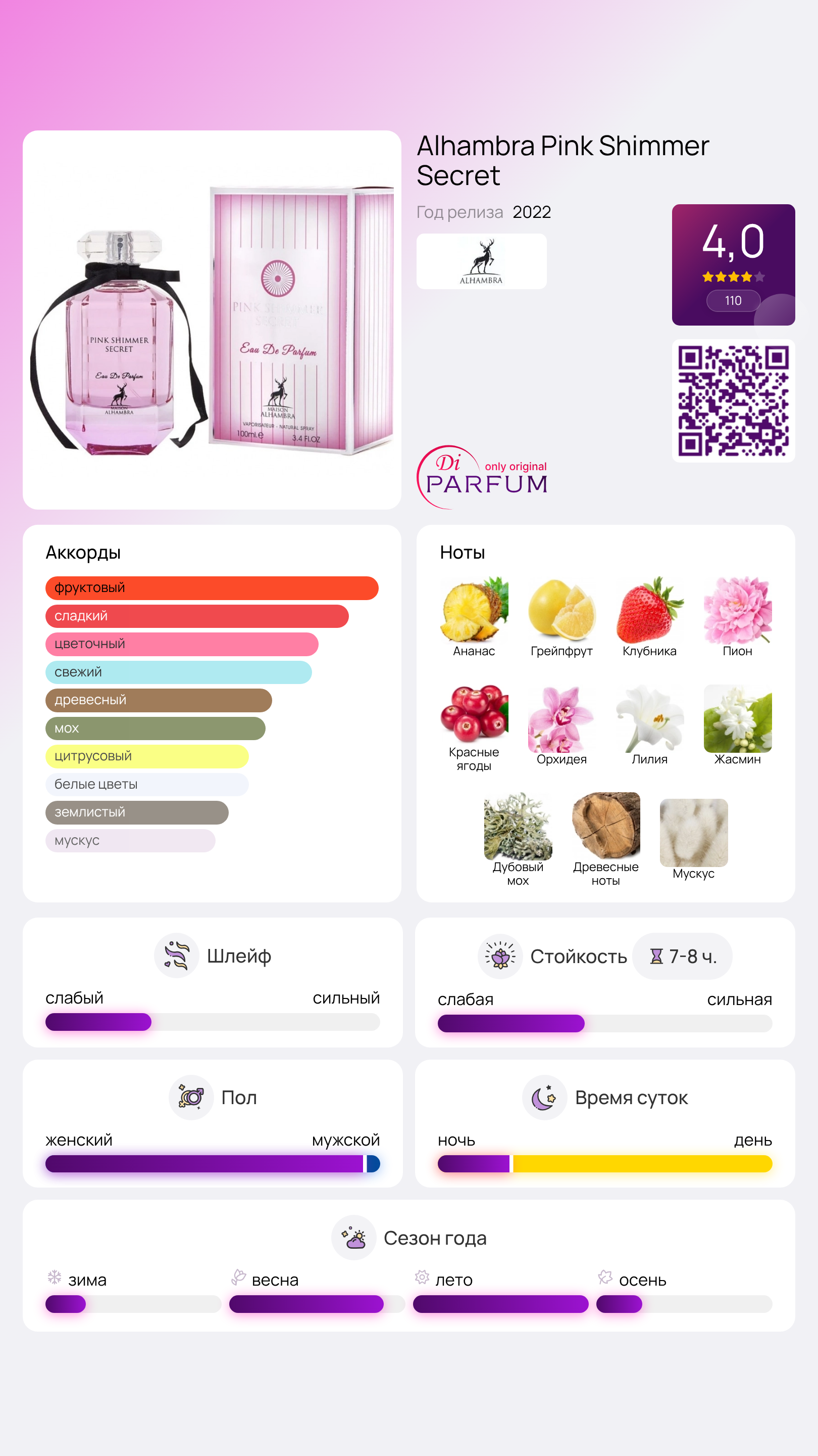 Pink Shimmer Secret идеально подходит для дневного использования и станет отличным дополнением к вашему образу на любое мероприятие. Этот аромат подчеркнет вашу женственность и привнесет в повседневность свежесть и утонченность.