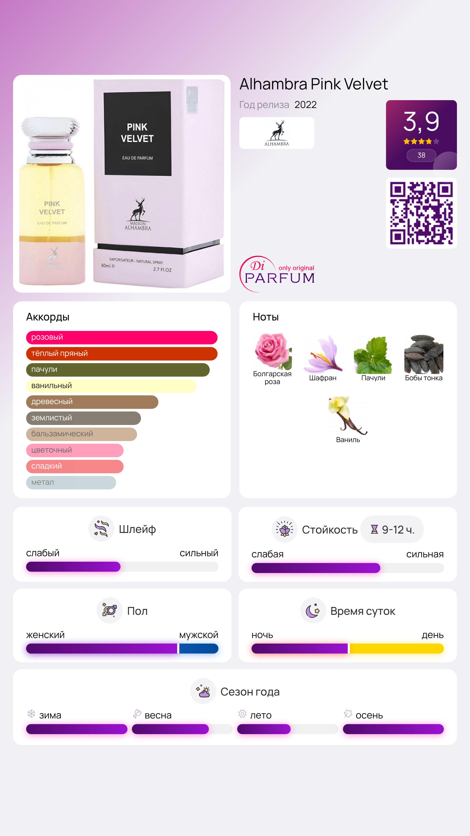 Pink Velvet от Maison Alhambra — это шипровый цветочный аромат для женщин, который был представлен в 2022 году. В верхних нотах ощущаются нежные розы из Болгарии и мая, в сердце композиции раскрывается турецкая роза, дополненная акцентами шафрана. Завершает ароматная палитра базовых нот пачули, бобов тонка и ванили, придающих аромату глубину и уют.