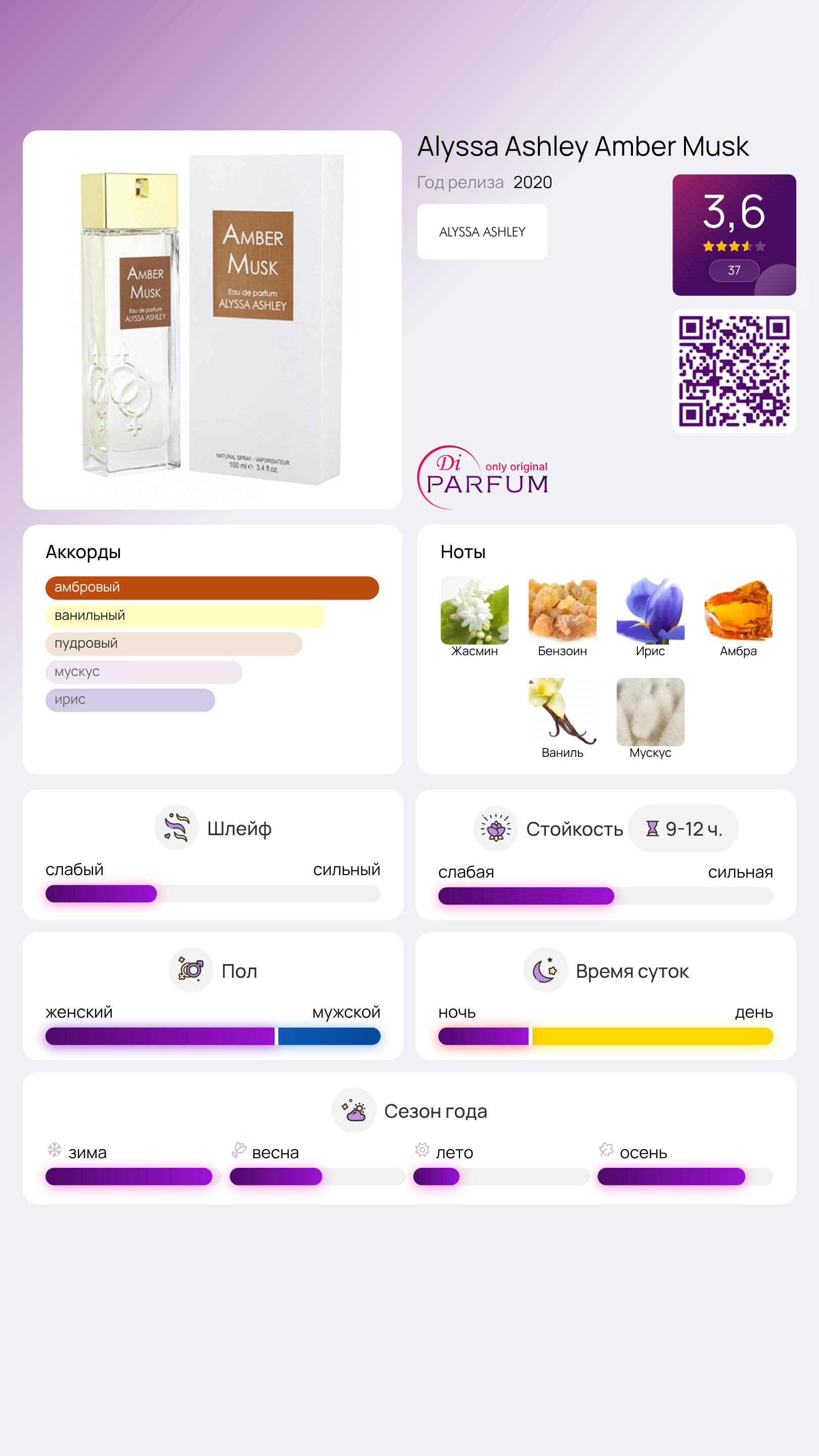Alyssa Ashley Amber Musk представляет собой цветочно-мускусно-древесный аромат, который создает уникальную обонятельную атмосферу, раскрывающуюся с разных ракурсов. Он напоминает мозаичный портрет, созданный английским художником Дэвидом Хокни, где каждый элемент добавляет свою ноту в общую картину. Этот эликсир — яркое свидетельство того, что истина может иметь множество оттенков.