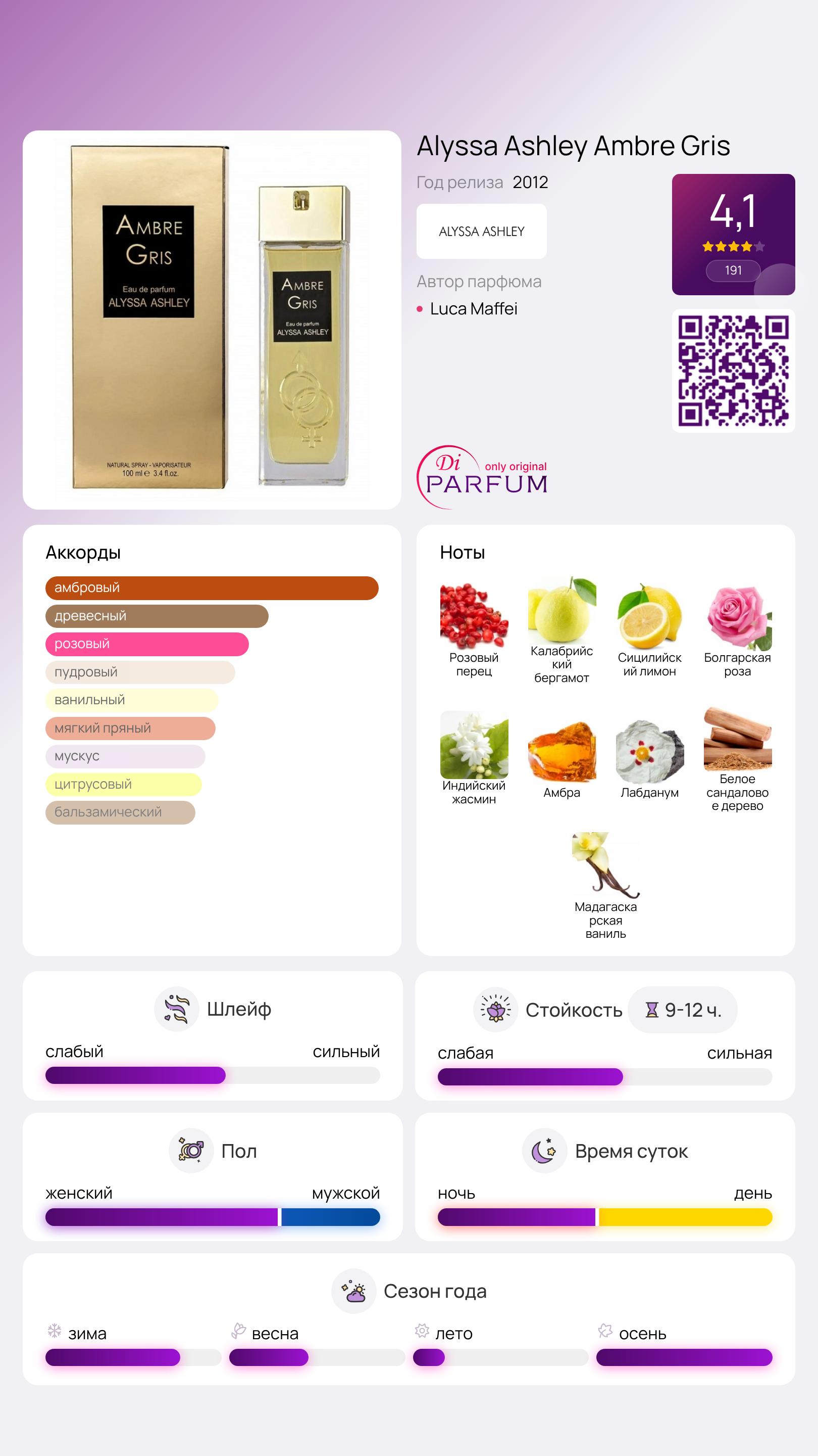 Теплый, ванильный шлейф завершается дурманящей дымкой марокканского лабданума, который нежно сочетан со сливочной сандаловой древесиной. Этот роскошный эликсир Ambre Gris от Alyssa Ashley представляет собой воплощение гламура и очарования, способного вызывать симпатию к своей обладательнице. Он пробуждает в мужчинах и женщинах желание приобщиться к ней, взять за руку. Этот аромат идеально подходит для прохладных дней и вечеров. Он был выпущен известным американским брендом в 2012 году.