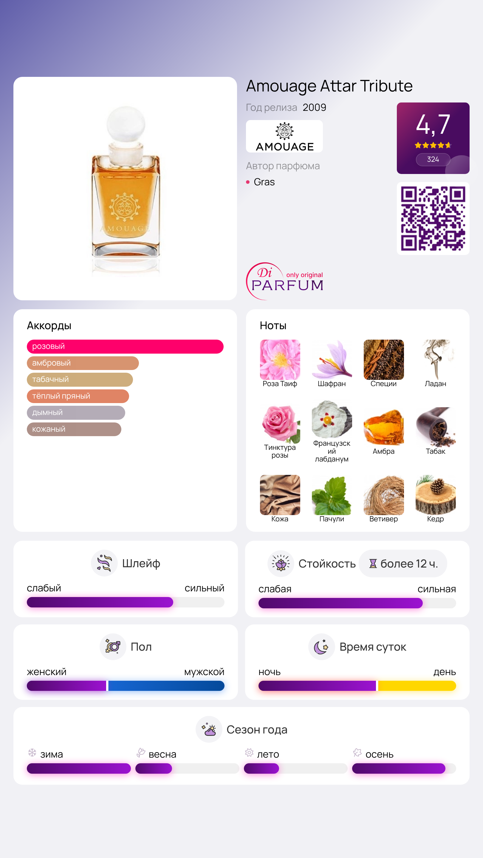 Amouage Attar Tribute представляет собой аромат, созданный из редких и ценных ингредиентов. Он обладает как нежностью, так и авторитетной мощью, что делает его универсальным выбором для любого повода. Флакон выполнен в традиционном роскошном стиле и доступен в объёмах 30 мл EDP и 12 мл, позволяя выбрать подходящий формат для вас.
