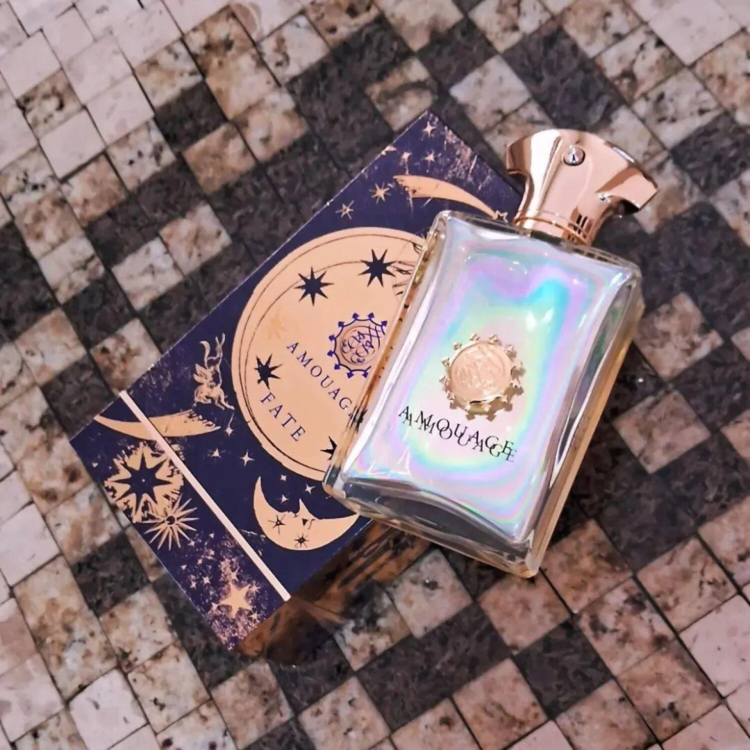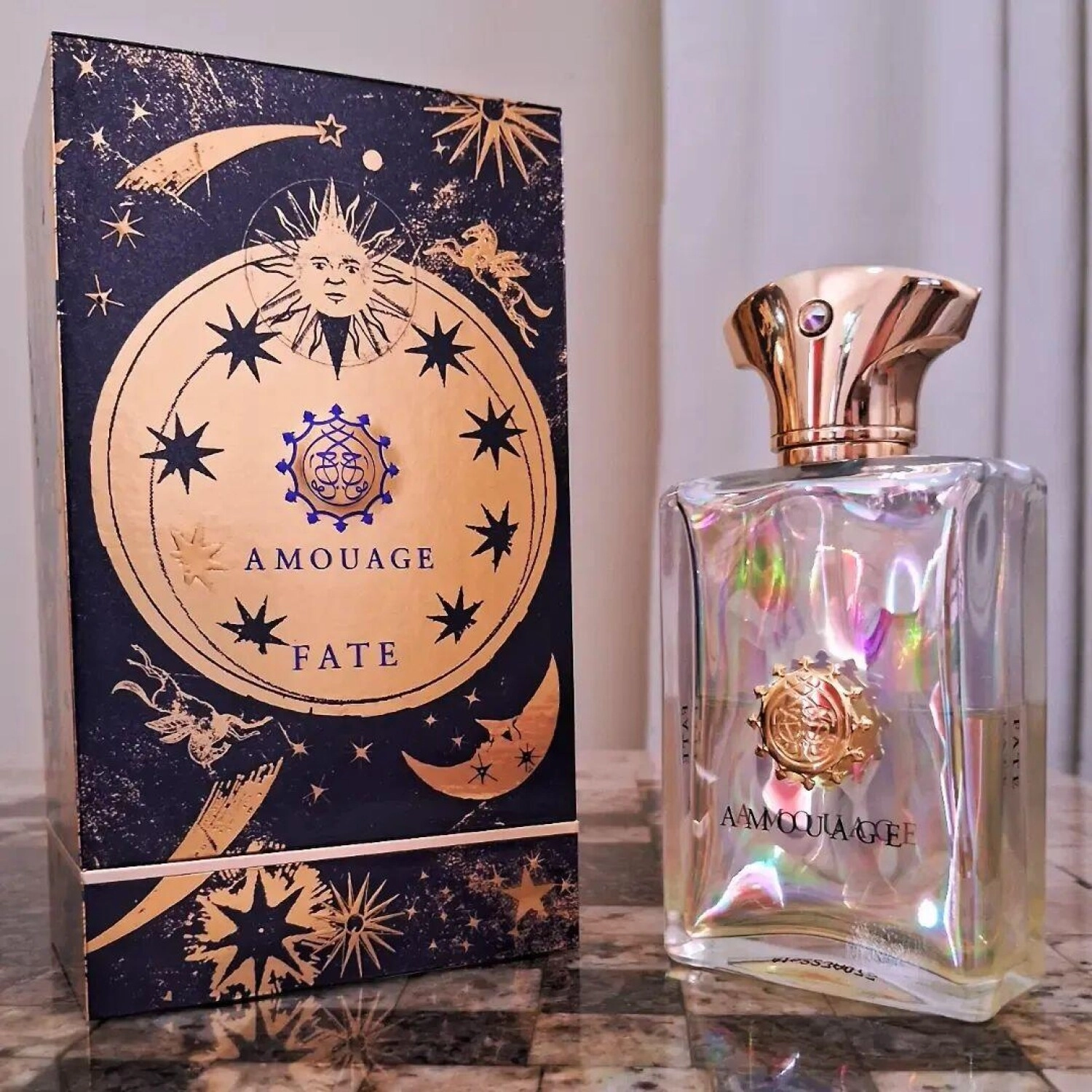 AMOUAGE предлагает новую уникальную парфюмерную пару под названием FATE, которая появилась на рынке летом 2013 года. Духи представлены в изысканных и роскошных флаконах, обладающих перламутровым блеском в таких оттенках, как желтый, фиолетовый, светло-зеленый и небесно-голубой. Золотые детали подчеркивают утонченность композиции. Эта сказочная коллекция также дополнена иллюстрациями Луны, Солнца и звезд на упаковках, которые удерживают ароматы на пьедесталах.
