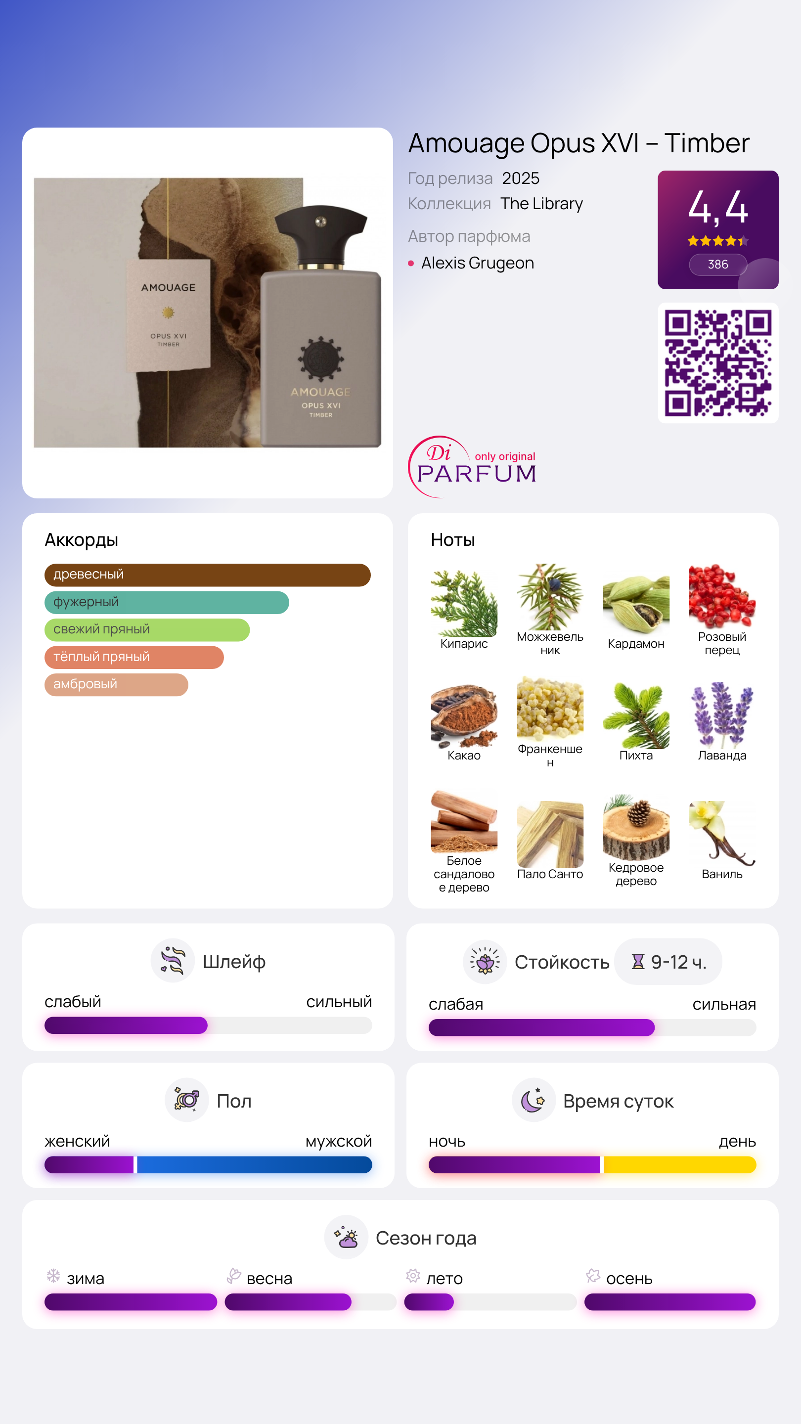 В сердце композиции располагаются ноты олибанума, пихты и лаванды, которые добавляют динамику и свежесть. База же состоит из сандала, пало санто, кедра, ванили и пачули, создавая ощущение глубокой мудрости и вечности. Opus XVI – Timber призван вызывать ассоциации как с первобытными, так и с природными формами знания, гармонично сочетая их с оптимизмом и надеждой на будущее.