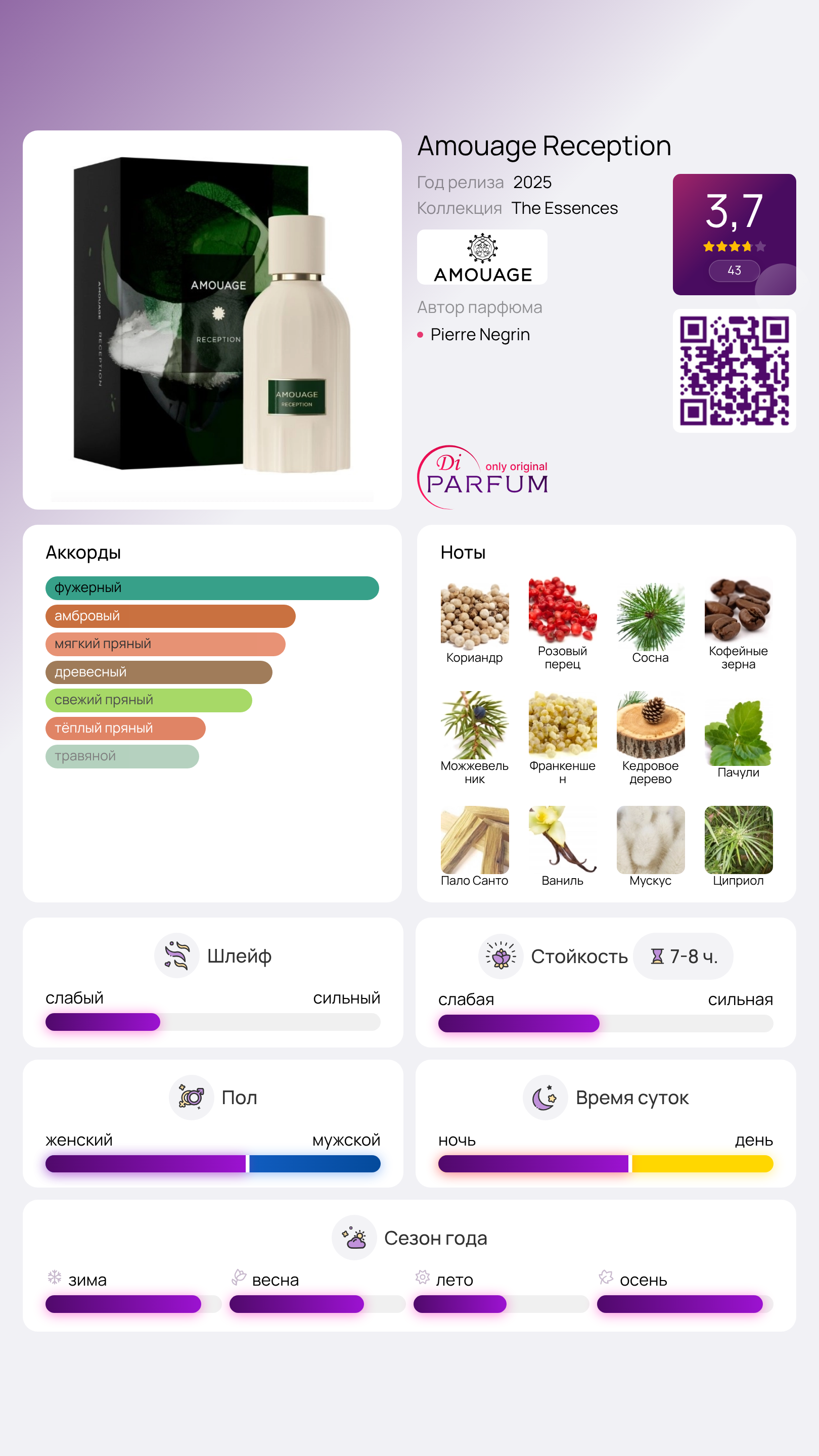 Парфюм, относящийся к гурманским и восточным семействам, представляет собой уникальное сочетание насыщенных и ярких нот. Основу аромата составляют пряные кориандр и розовый перец, которые придают ему особую остроту и шарм. Лесные акценты сосны и можжевельника добавляют глубины и свежести, создавая многослойный пирамидальный эффект.