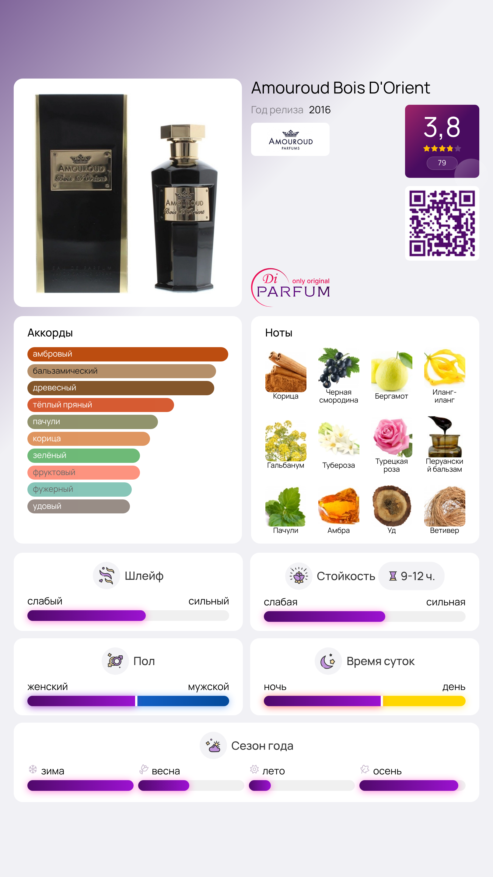 Благодаря сбалансированной композиции, этот аромат подходит как мужчинам, так и женщинам. Древесно-восточные ноты начинают раскрываться свежестью бергамота, который отлично дополняется ягодной кислинкой черной смородины. Теплая корица придает пикантную нотку, которая плавно переходит в цветочное «сердце» композиции.