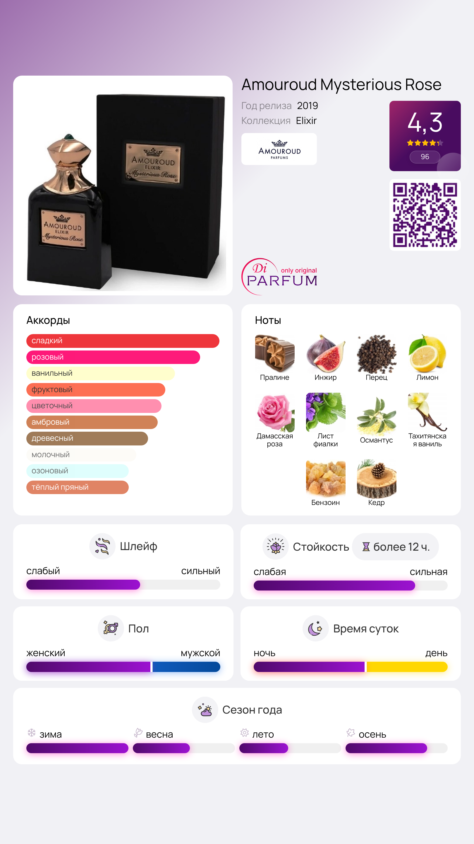 Mysterious Rose от Amouroud — это роскошная композиция, идеально подходящая для мужчин и женщин в холодное время года. Аромат воплощает чувственность и глубину для тех, кто прислушивается к своим инстинктам и вкусу. Он появился в 2019 году в рамках коллекции Elixir Collection и представлен в эффектном черном флаконе с золотистым колпачком-короной и массивным «изумрудом», помещенным на зеленый атлас в стильной угольной коробке.