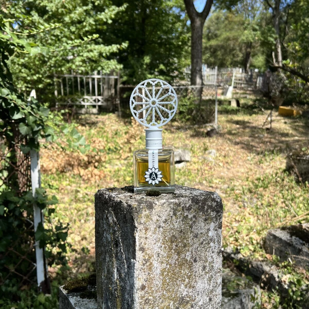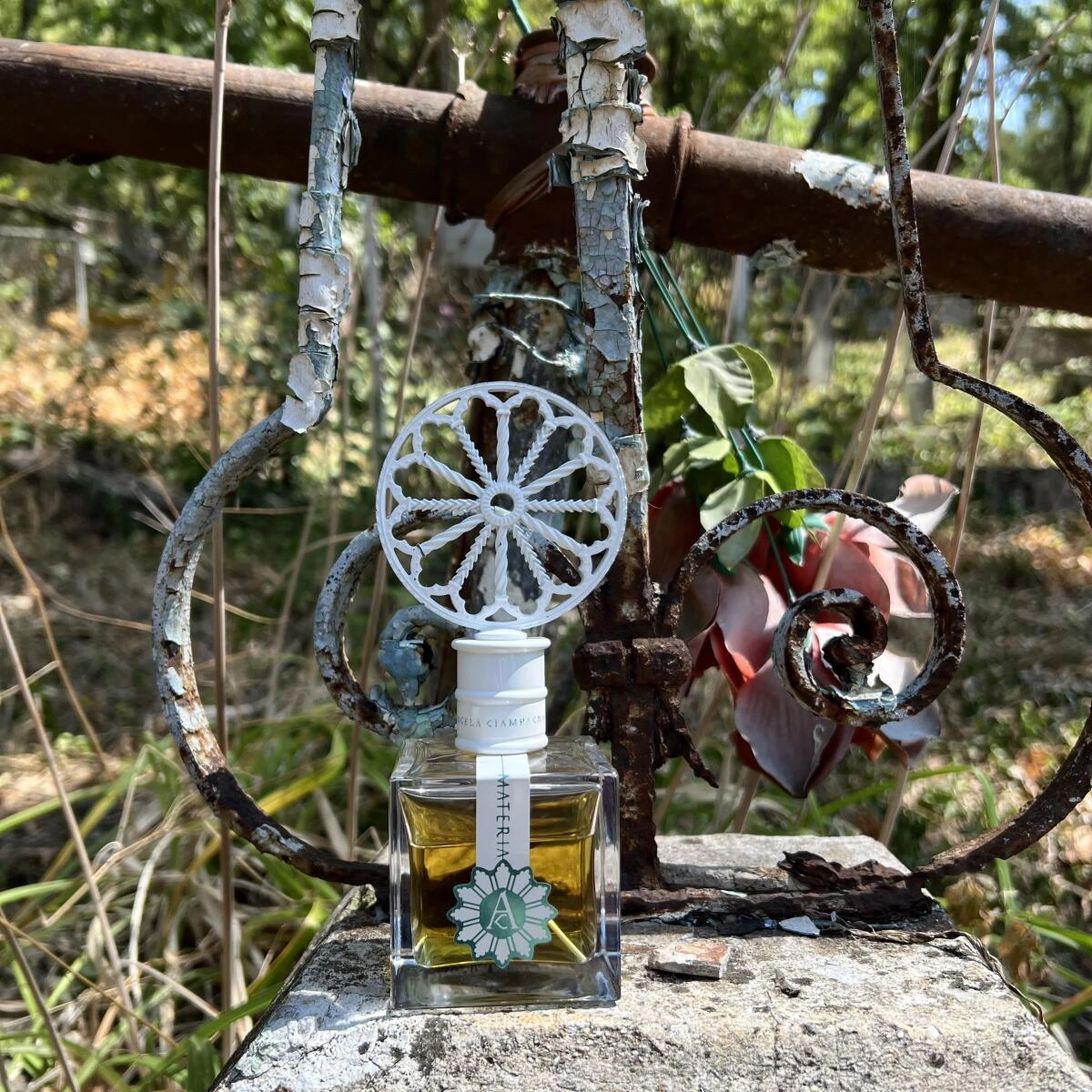 Густая, насыщенная композиция Materia от Angela Ciampagna является ярким выражением "всего телесного и земного" в рамках коллекции под названием «De Vita», представленном на Миланской выставке Esxence 2018. Этот аромат погружает в глубины жизни и смерти и предназначен как для мужчин, так и для женщин, которые тяготеют к "темным", насыщенным композициям, напоминающим о древних культах. Белый цвет языческого символа Солнца на прямоугольном флаконе символизирует чистоту, перерождение и новые начала в жизни.