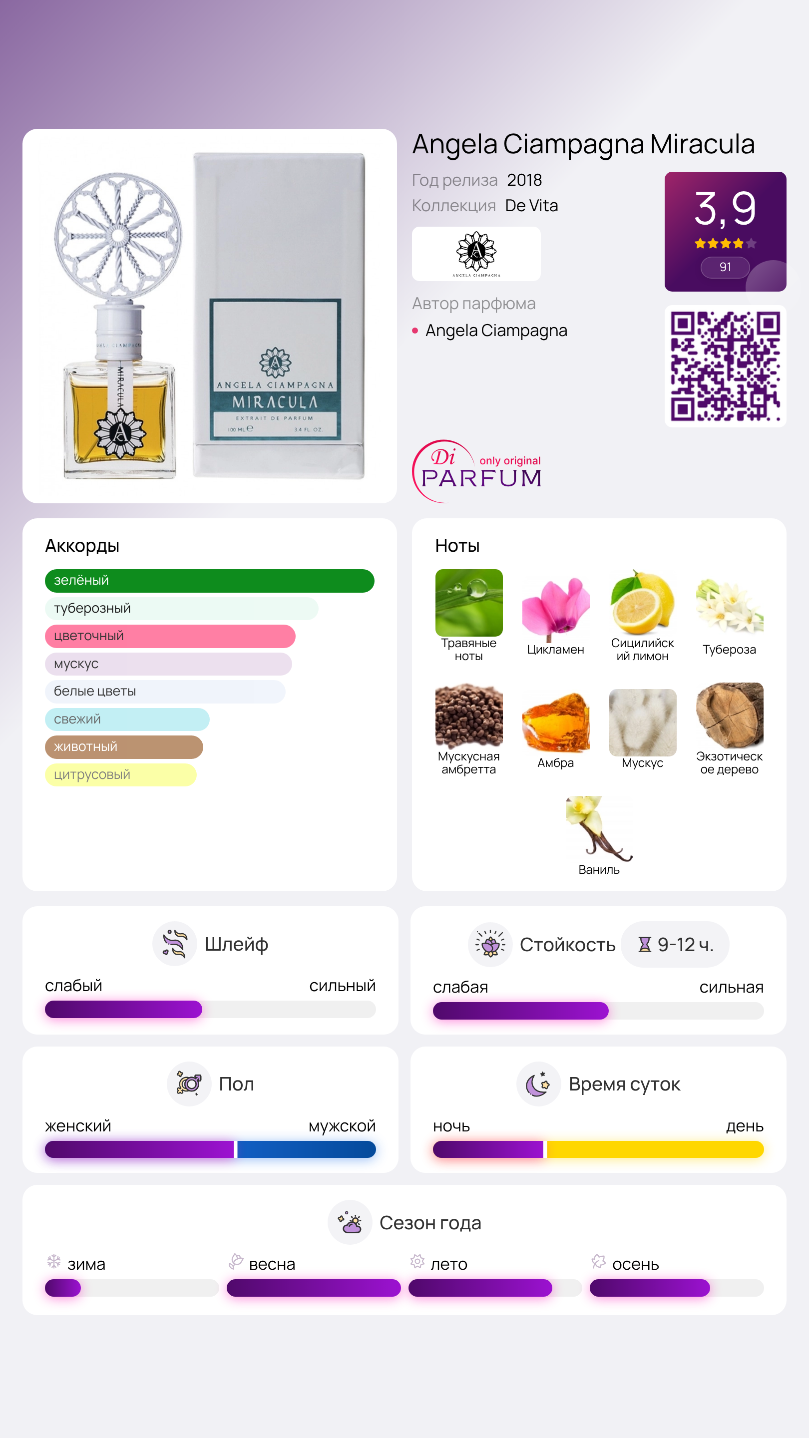 Элегантный амбровый аромат Angela Ciampagna Miracula представляет собой истинное чудо аромата. Он стал частью третьей коллекции итальянского бренда «De Vita», выпущенной в 2018 году, и воплощает в себе яркость солнечного света, радость плотских наслаждений и красоту летней природы. Этот парфюм способно привлечь внимание своим очарованием любви.