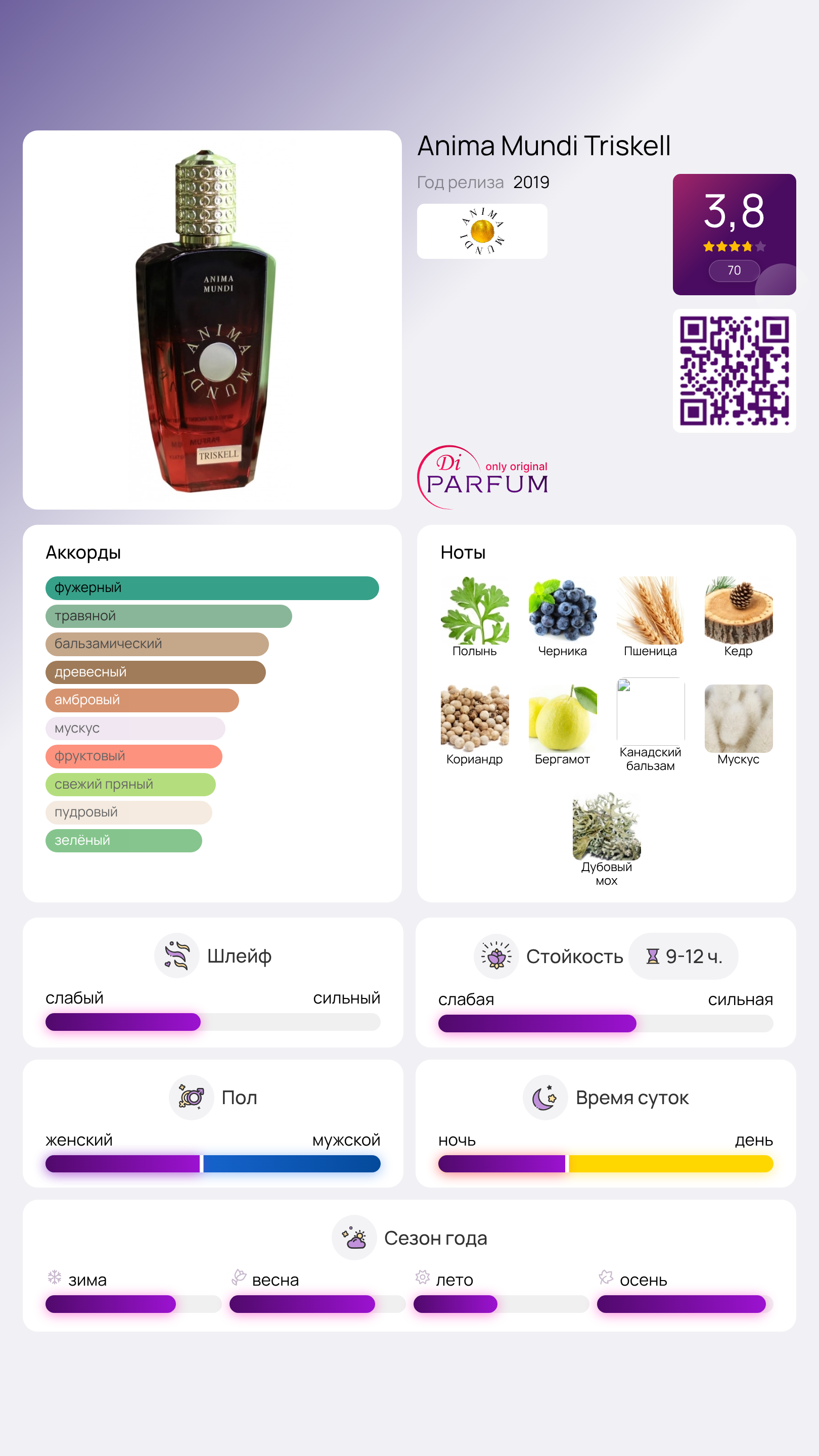 Эликсир Anima Mundi Triskell представляет собой удивительное сочетание древесных восточных нот, рассказывающее о затерянных в лесной тени эльфах, которые уважительно относятся ко всему живому и ценят дары природы. Название «треножник» происходит из кельтской культуры и символизирует движение солнца по небесам.