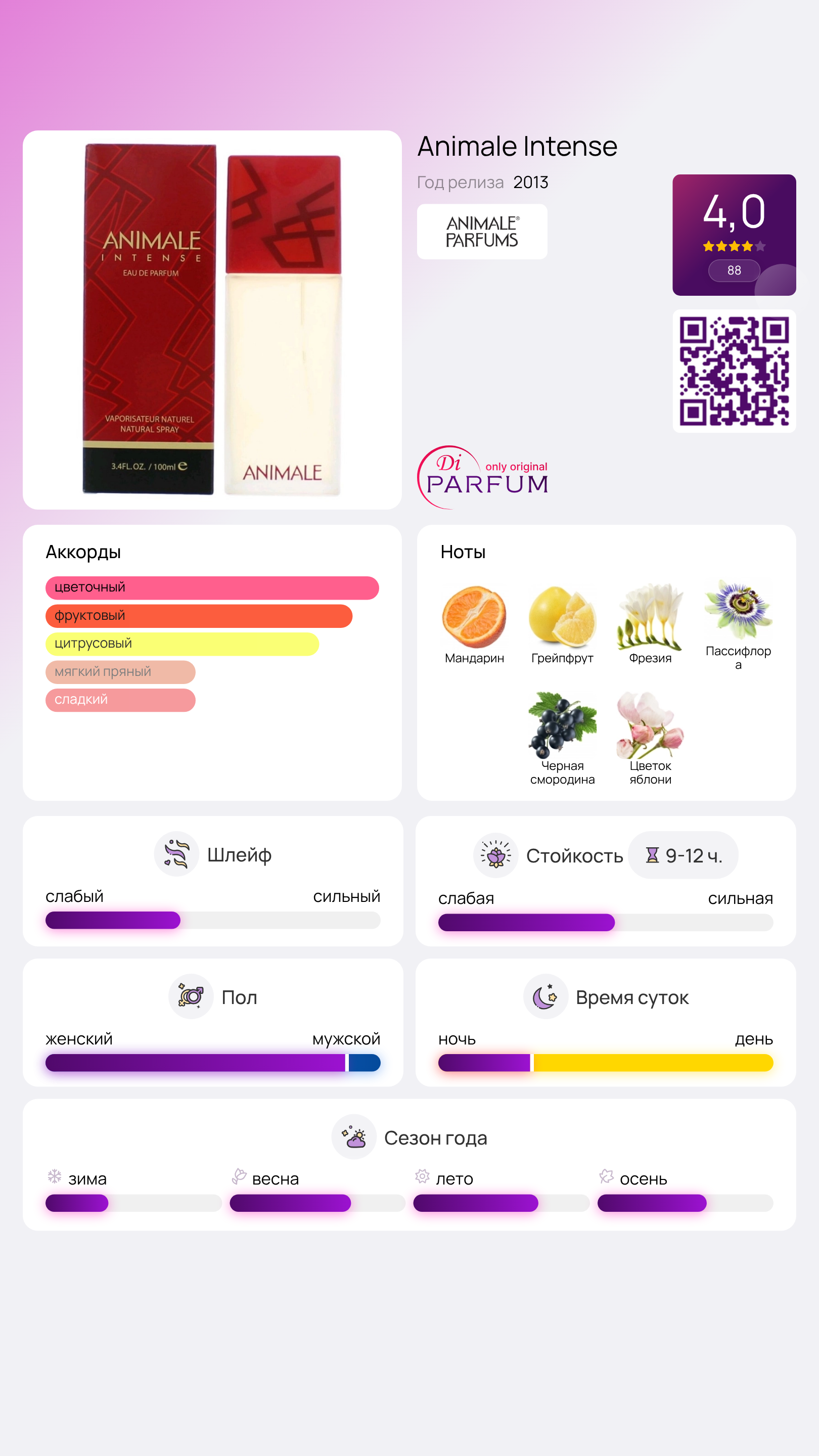 Бренд Animale из Индонезии считается одним из самых известных мировых имен, который с момента своего создания задает направления в мире парфюмерии. Каждое произведение мастеров этого ароматического дома получает восторженные отзывы и со временем становится классикой. Яркий пример такого успеха – аромат Intense, который был представлен в 2013 году и быстро завоевал популярность. Ценители цветочных композиций высоко оценили его динамичное звучание и изысканное традиционное послевкусие.