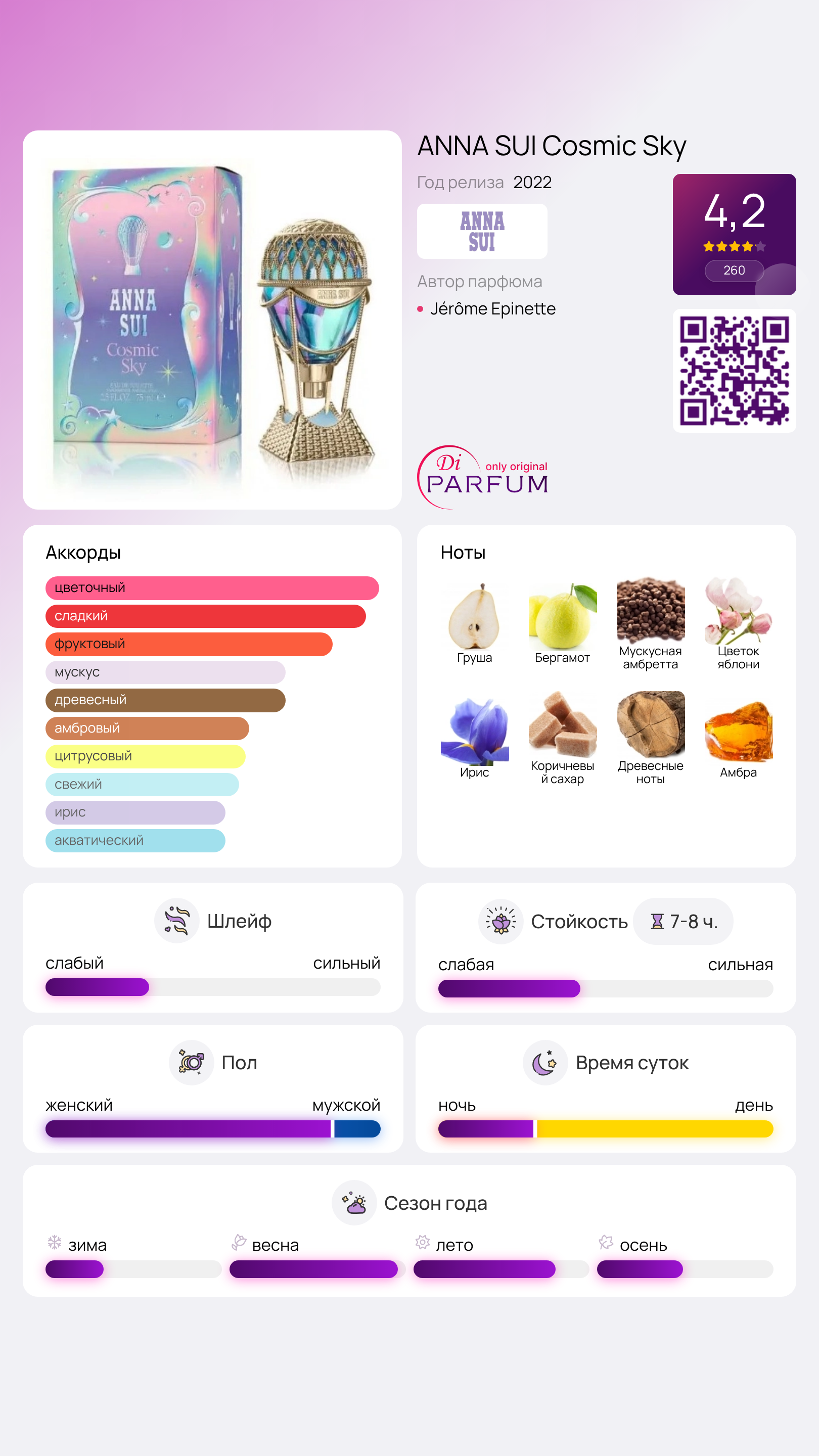 Аромат ANNA SUI Cosmic Sky создает удивительную атмосферу, полную мечтаний и фантазий. Это обновленная версия фланкера, выпущенная в 2020 году, которая черпает вдохновение из безграничного космоса, существующего как снаружи, так и внутри каждого человека.