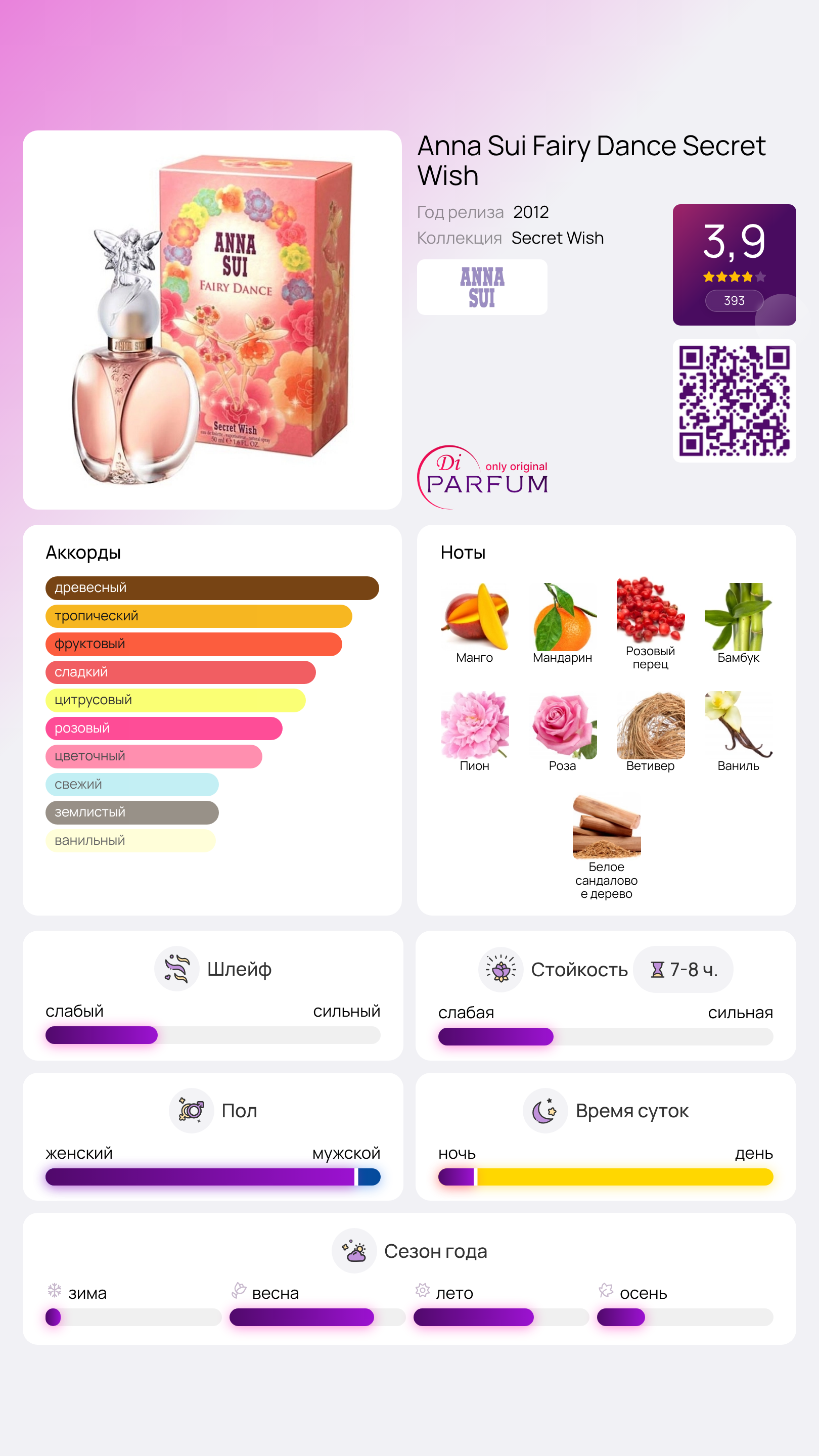 Парфюм Anna Sui Fairy Dance от Anna Sui получил огромную популярность летом 2012 года благодаря своему фруктово-цветочному аромату для женщин. Его ноты принесли радость и ощущение легкости, погружая в мир безмятежного счастья.