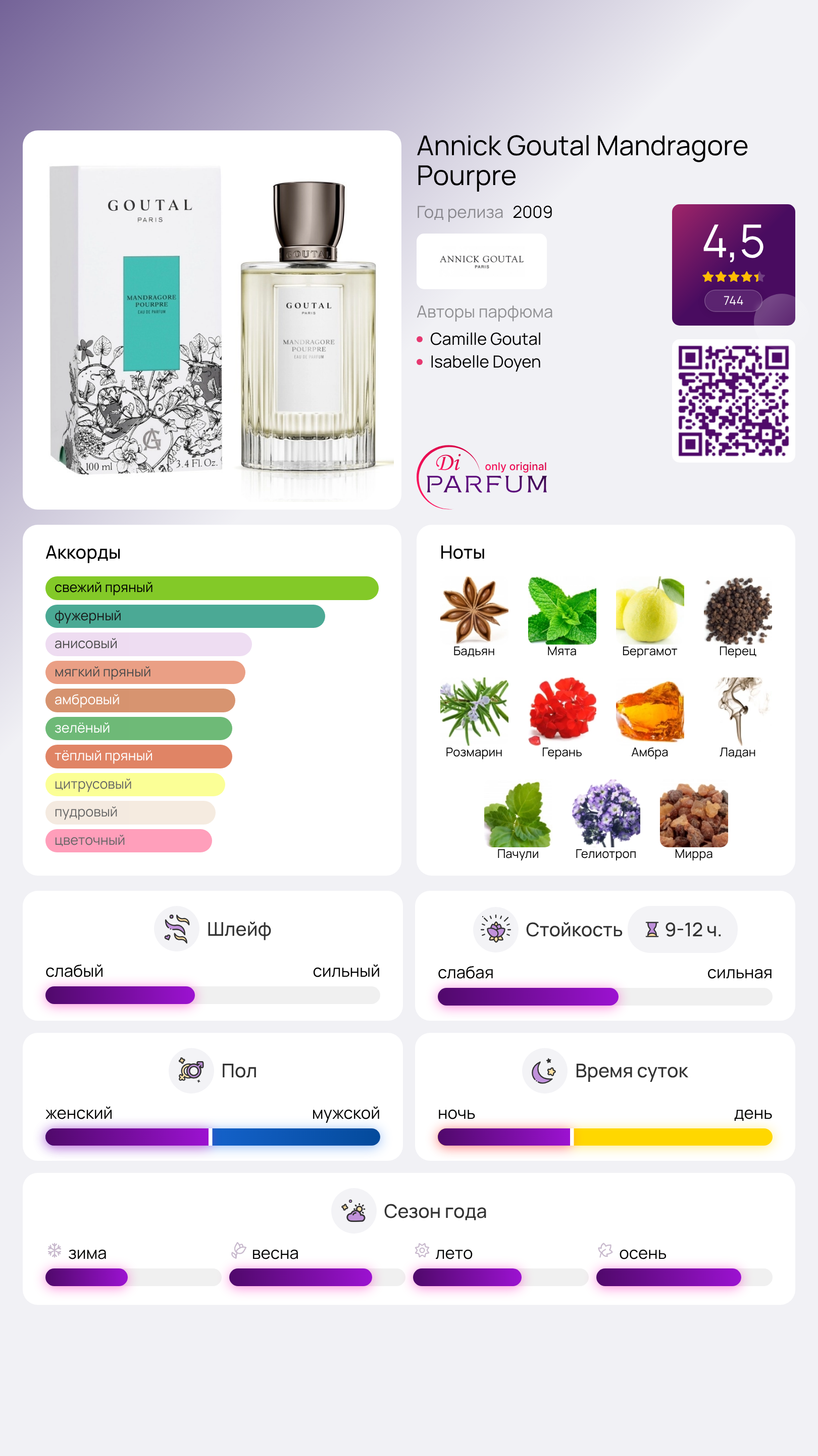 Мандрагора, славящаяся своими удивительными целебными и омолаживающими свойствами на протяжении веков, вдохновила Камиллу Гуталь и Изабель Доуэйн на создание аромата Mandragore Pourpre, который является реинкарнацией известного парфюма 2005 года.