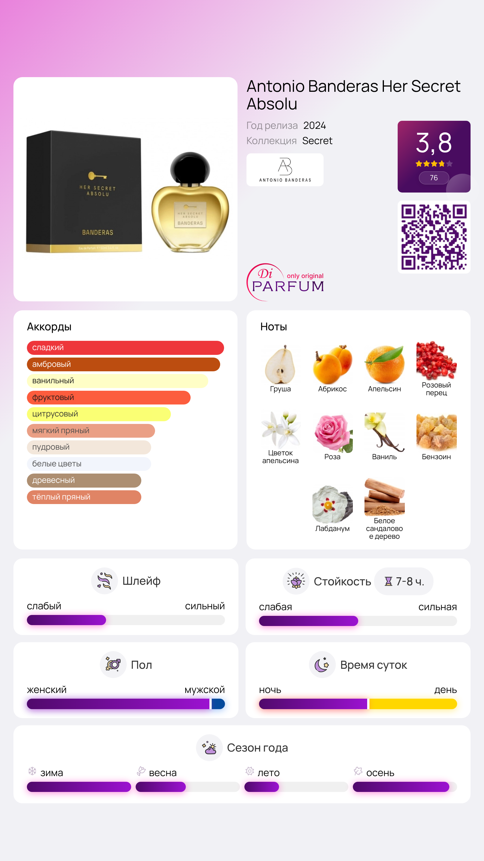 Этот аромат определенно не оставит равнодушным. Он идеально подойдет для смелой и уверенной женщины, которая точно знает, чего хочет. Своей манящей таинственностью она успешно завораживает, обладая ключом к разгадке Antonio Banderas Her Secret Absolu.