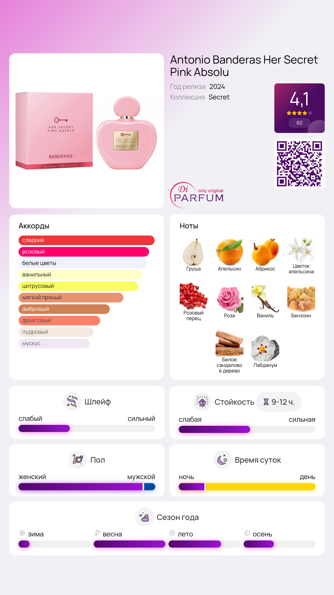 Her Secret Pink Absolu от Antonio Banderas — это восточно-цветочный аромат для женщин. Этот парфюм стал новым пополнением в линейке Her Secret и был выпущен в 2024 году. Аромат открывается нежными и сочными верхними нотами груши, апельсина и абрикоса, создавая свежую и яркую атмосферу. Сердце композиции наполняется утонченностью цветка апельсина, розы и розового перца, что добавляет несколько пряных нот в общую палитру.