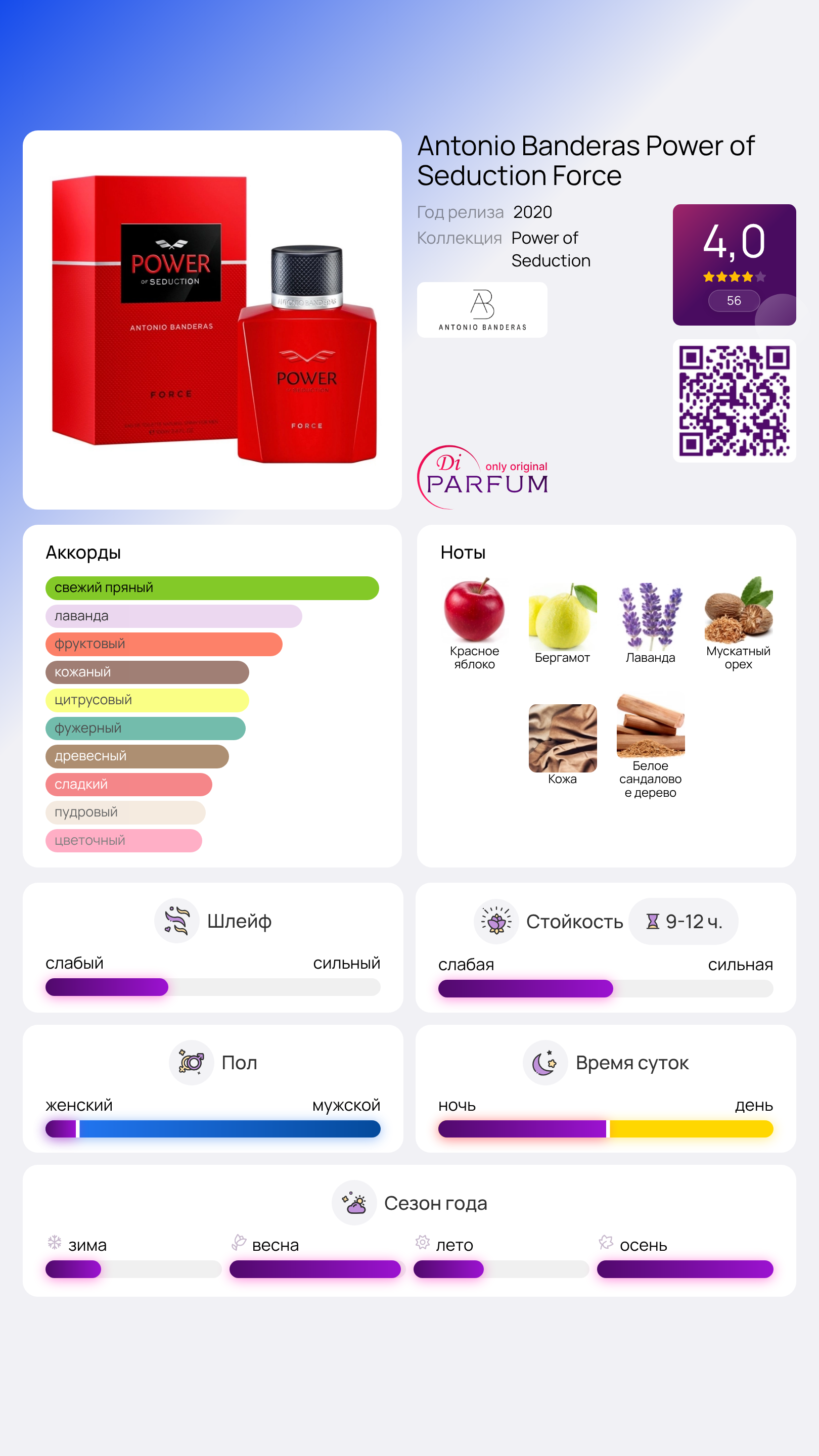 Аромат Power of Seduction Force от Antonio Banderas станет настоящей находкой для поклонников древесных и пряных нот. Его притягательность поразительна и не оставляет равнодушным. Выпущенная в 2020 году туалетная вода олицетворяет харизму и сексуальность самого Антонио Бандераса. В этом темно-красном флаконе заключены бесконечная энергия и современный блеск. Цвет и спортивная форма колпачка отражают дух приключений.