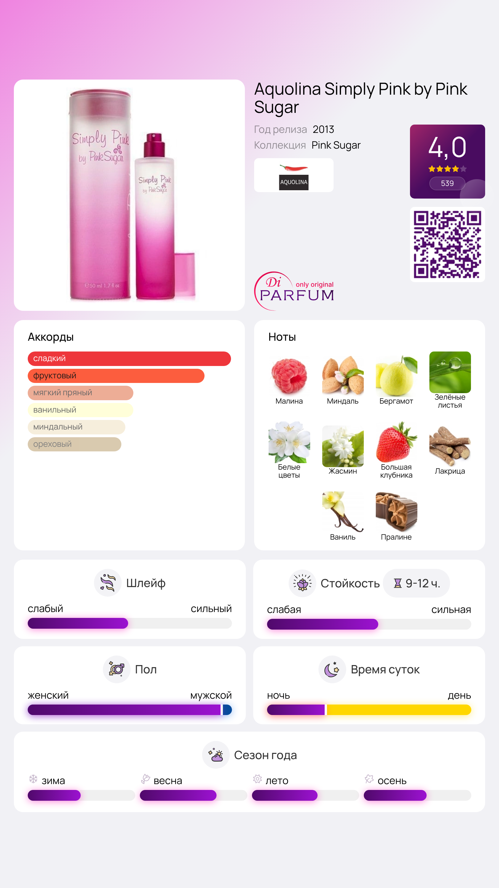 С самого начала композиция раскрывается взрывом лесной земляники и искрящегося бергамота, затем переходя в пленительное сердце из жасмина с добавлением нежного пралине и лакрицы, оставляя после себя чарующий карамельный шлейф. Такое изобилие аппетитных ноток делает Simply Pink настоящим парфюмерным угощением.