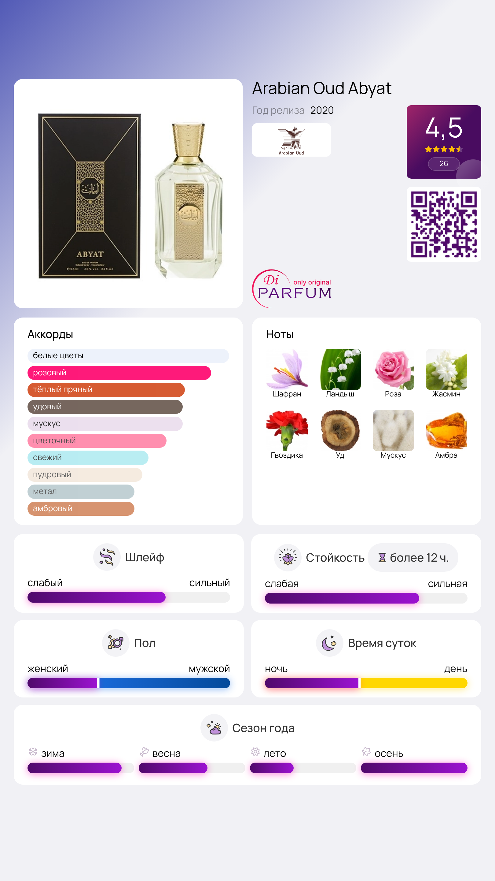 Поддерживающее ориентальное звучание образуется благодаря агаровому дереву, сопровождаемому янтарной амброй и соблазнительным мускусом. Композиция Abyat от Arabian Oud создана для уверенных в себе, состоявшихся людей и выпущена в 2020 году шейхом, который долгие годы путешествовал в поисках эфирных масел и растений.
