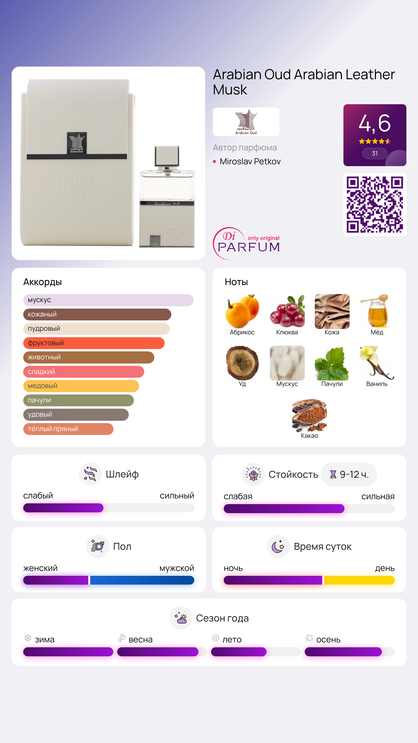 Аромат Arabian Oud Arabian Leather Musk поражает своей невероятной красотой и посвящен изысканному арабскому кожаному мускусу. Эта ароматическая композиция обладает способностью завораживать и отлично дополняет образ целеустремленного человека, который достиг значительных успехов.