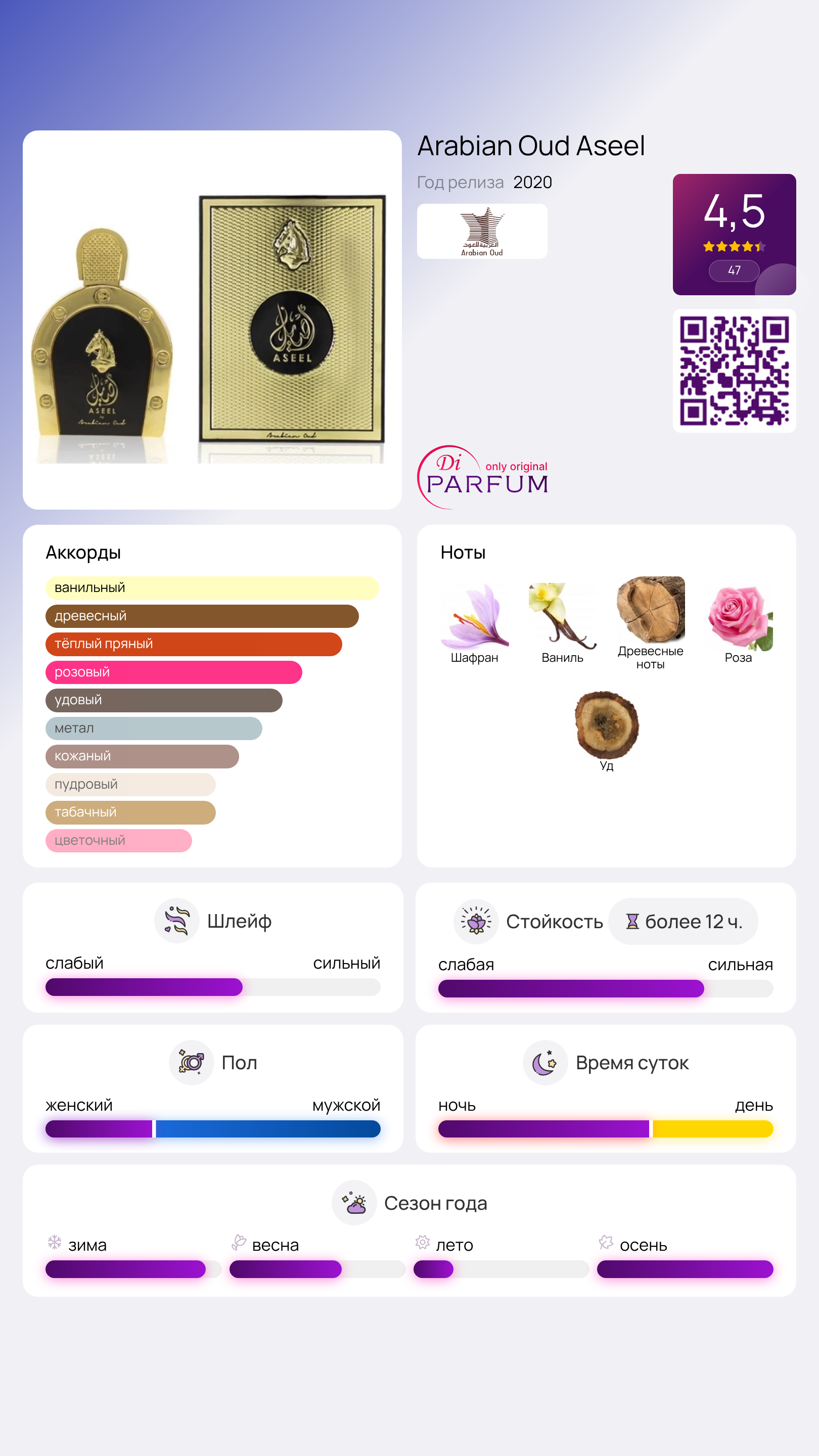 Аромат Arabian Oud Aseel, созданный арабским брендом в 2019 году, представляет собой изысканный мужской восточный парфюм. Название "Асил" ассоциируется с рыцарем Востока – смелым и победоносным мужчиной, который привлекает внимание женщин. Парфюмерная пирамида изобилует древесными и цветочными нотами, гармонично соединяясь с фруктовыми аккордами.