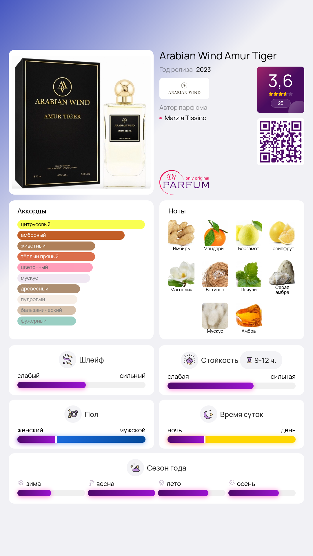 Изящный шлейф оставляет за собой волнующие ноты мускуса и смолистую амбру. Аромат Amur Tiger от Arabian Wind был выпущен в 2023 году как часть первой коллекции, адресованной целеустремленным и уверенным мужчинам и женщинам. Этот амбициозный арабский бренд знает толк в создании высококачественной парфюмерии. Стильный флакон выполнен из прочного, полированного стекла с округлыми формами.