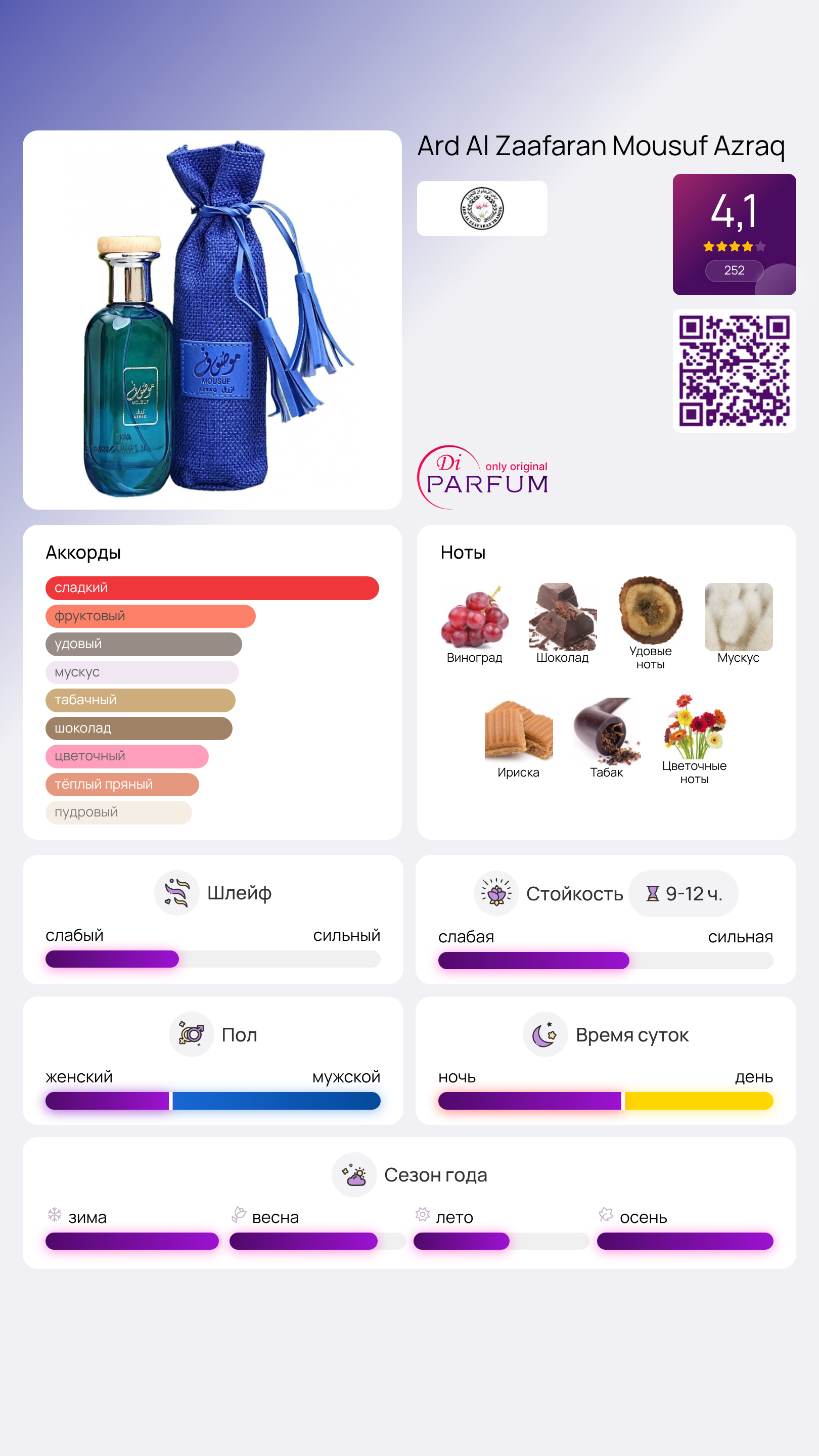 Эта композиция призвана порадовать поклонников ориентальной парфюмерии благодаря своему уникальному составу и стойкому ароматическому шлейфу. Ard Al Zaafaran Mousuf Azraq подходит как для мужчин, так и для женщин, стремящихся подчеркнуть свою харизму и уникальный стиль.