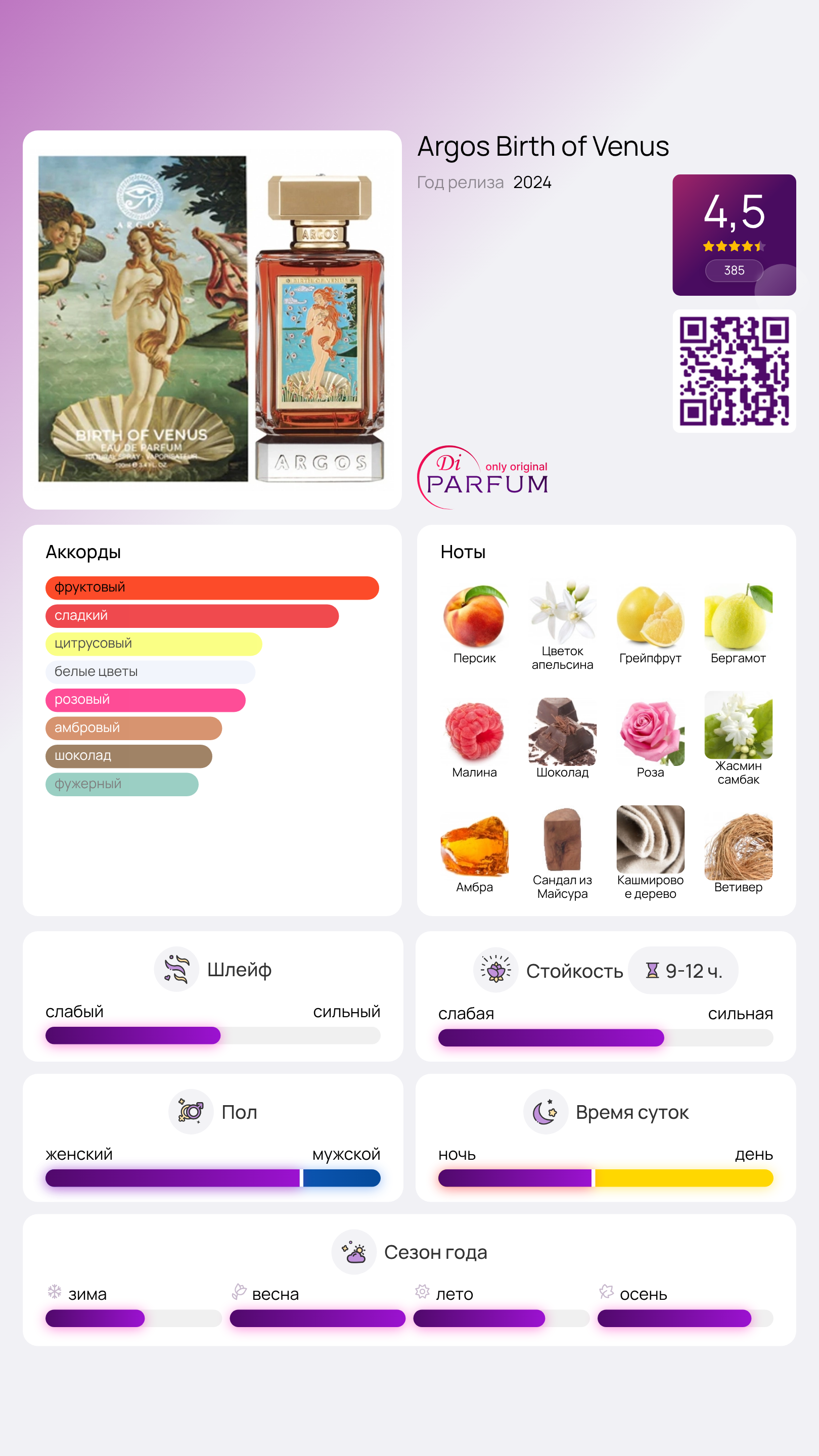 Birth of Venus от Argos — это восточно-цветочный аромат для женщин, обладающий уникальным и захватывающим характером. Этот новый парфюм был представлен в 2024 году и быстро завоевал популярность благодаря своему сложному составу. В верхних нотах сочетание персика, цветка апельсина, грейпфрута, бергамота и лаванды создает свежий и яркий ароматный букет.