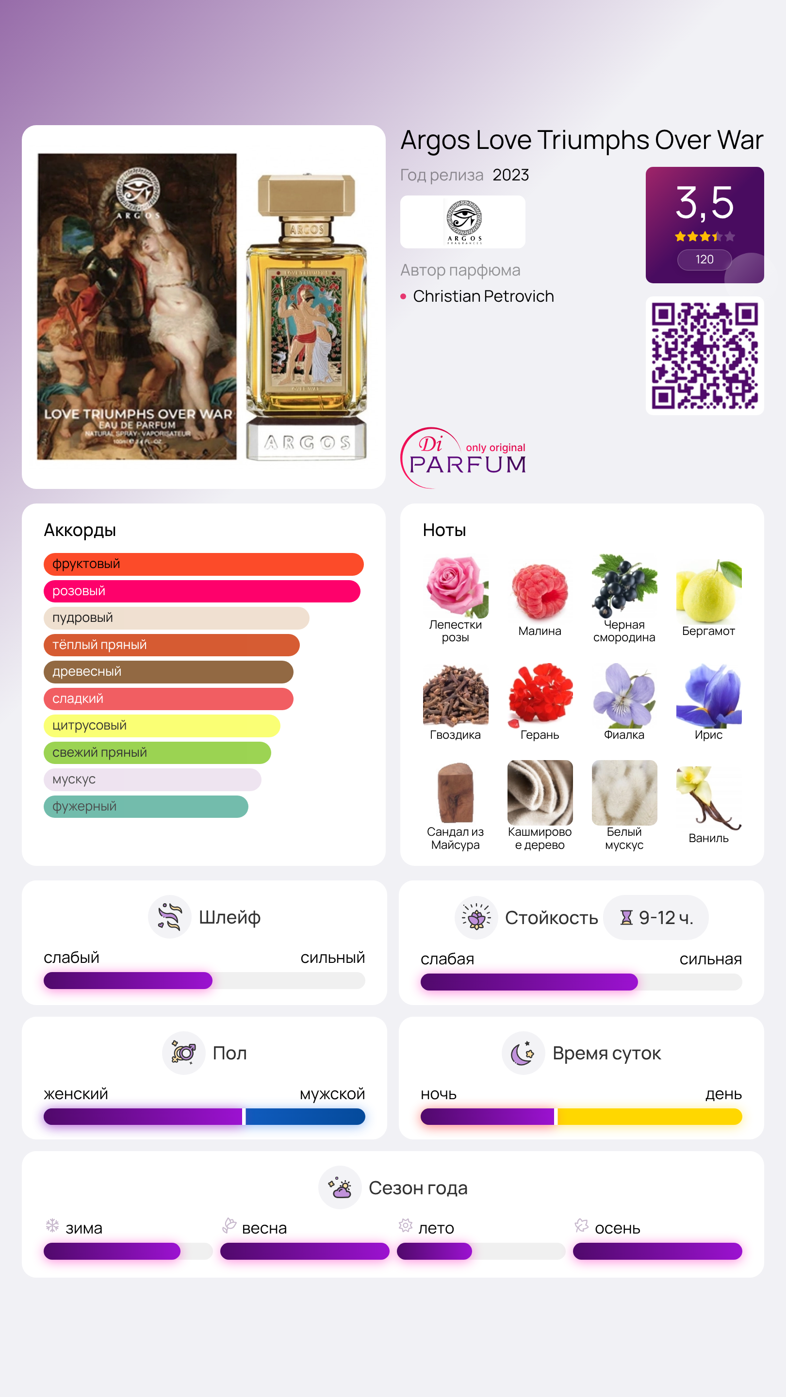 Love Triumphs Over War от Argos — это восточно-цветочный аромат, созданный для мужчин и женщин. Он был запущен в 2023 году и стал новым творением талантливого парфюмера Кристиана Петровича. Этот аромат предлагает уникальное сочетание нот, которые созданы для того, чтобы подчеркнуть красоту любви и ее победу над войной.