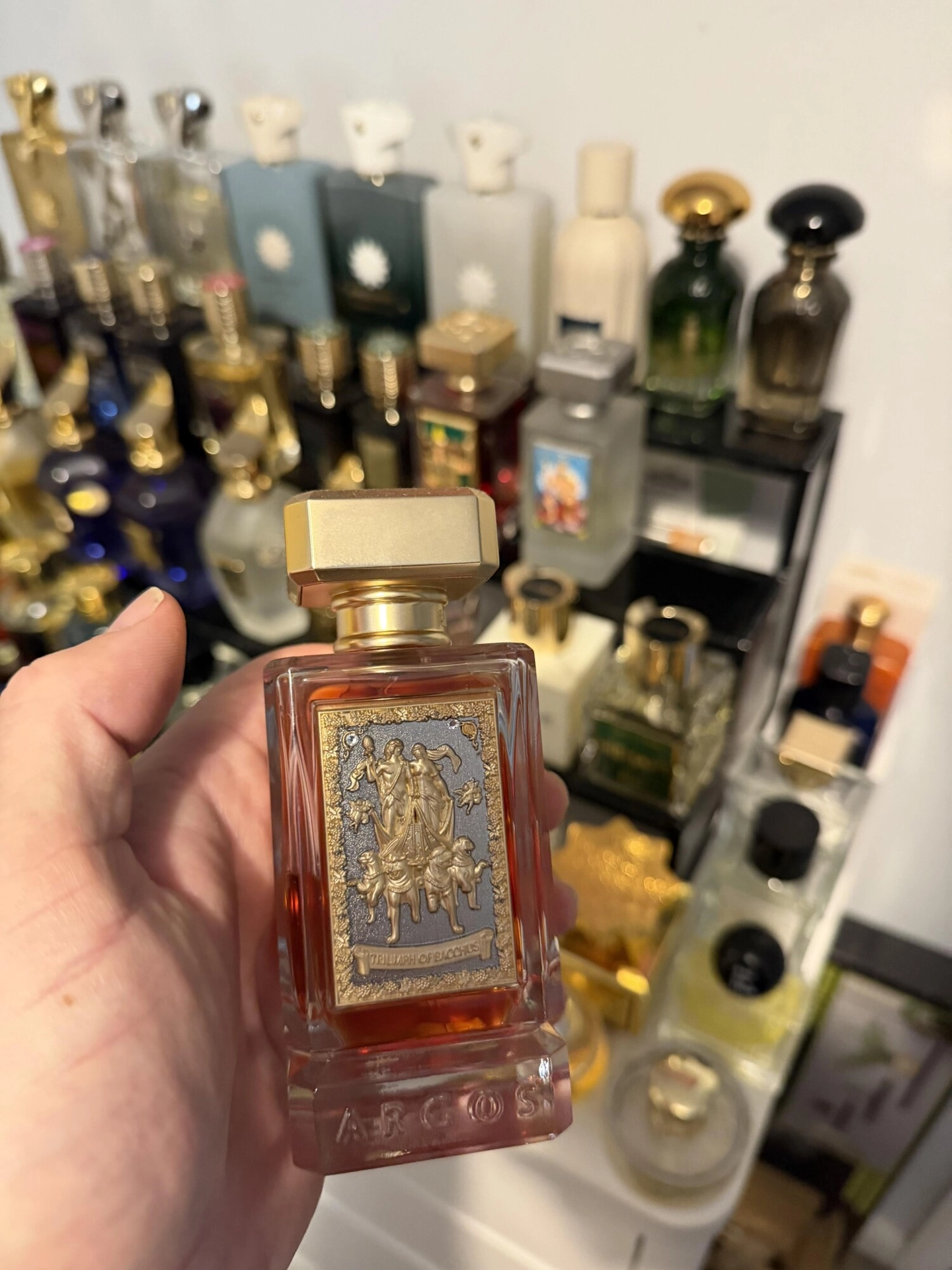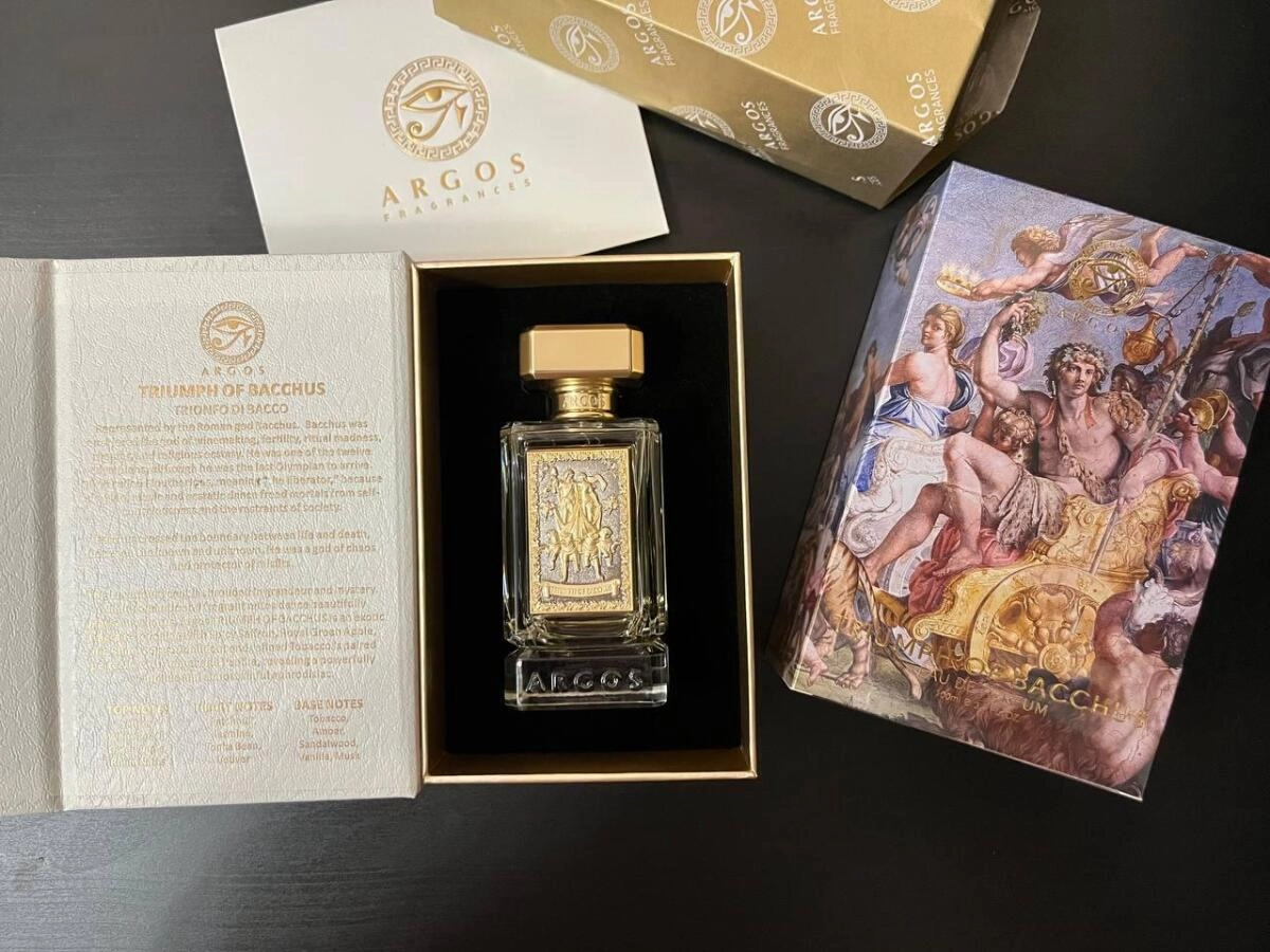 Композиций Triumph Of Bacchus от Argos заявляет о себе как о сильном и привлекательном афродизиаке с оттенком греха. Прямоугольный флакон с янтарной жидкостью украшен золотым барельефом, изображающим богов на колеснице, окруженной цветами. Упаковка декорирована репродукцией художественного произведения на тему триумфа Вакха. Этот необычный аромат был выпущен американским брендом в 2019 году.