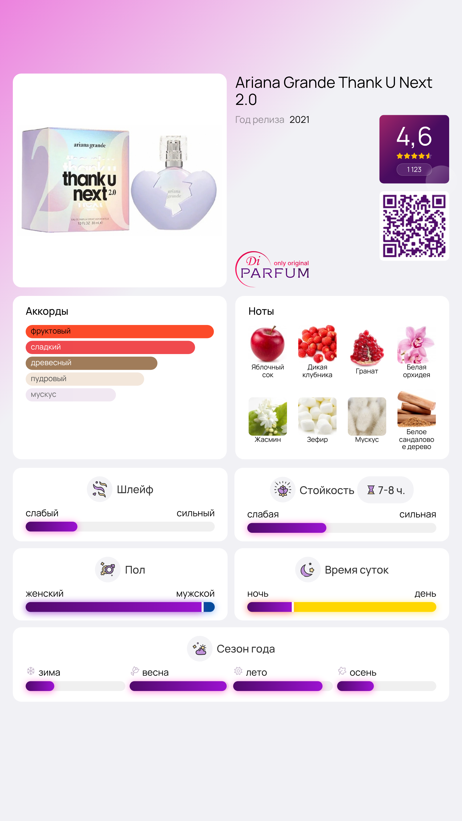 Верхние ноты аромата включают в себя сочный яблочный сок, спелую дикий землянику и сладкий гранат, создавая первую волну нежного и игривого звучания. Сердце композиции раскрывается цветочной гармонией белой орхидеи и жасмина, добавляя элегантности и романтики. Завершает ароматная симфония база из маршмеллоу, мускуса и сандалового дерева, которая придает чувственности и тепла.