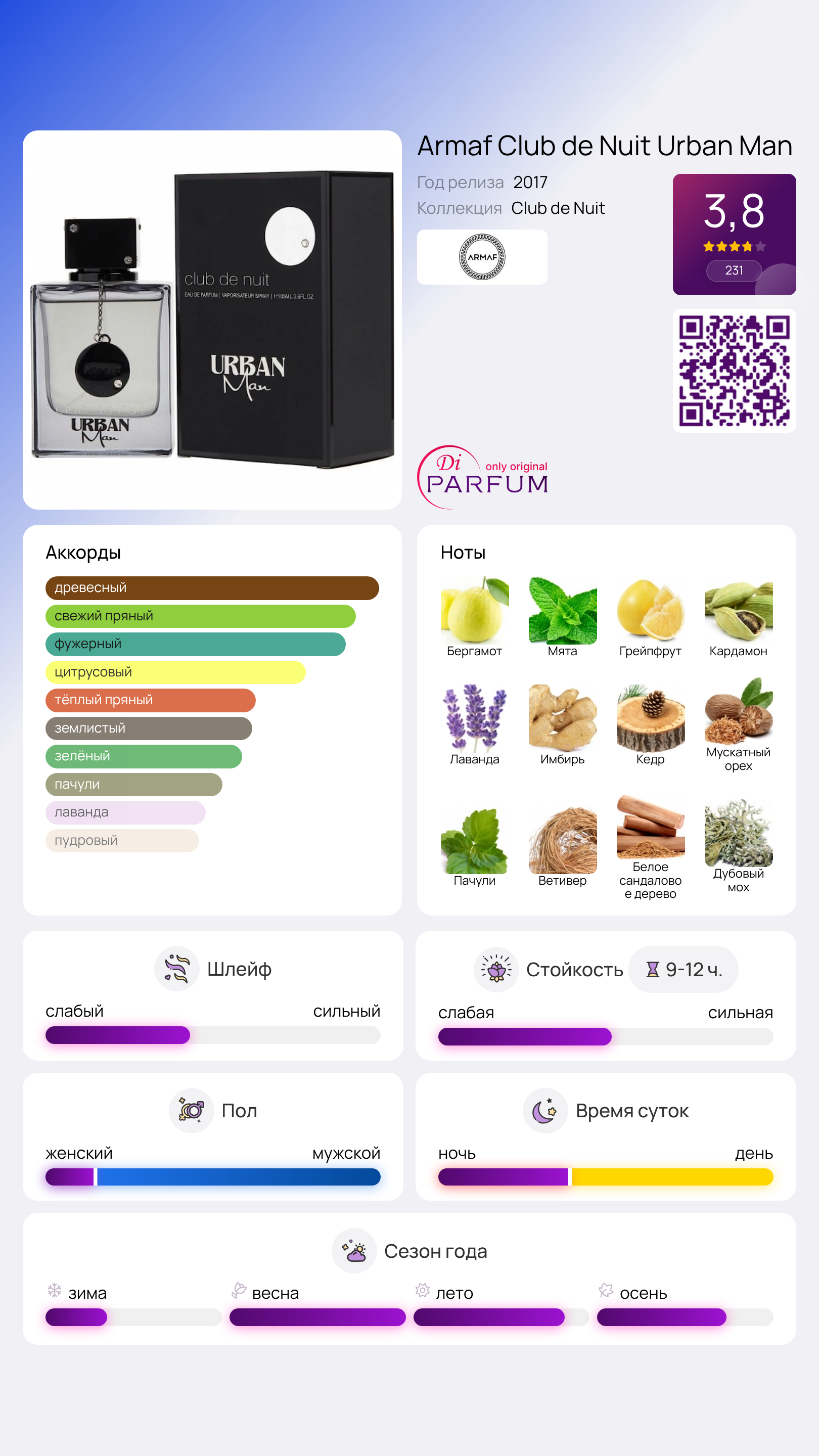 Аромат Armaf Club de Nuit Urban Man, наполненный пряными древесными нотами, черпает вдохновение из очарования осеннего сезона. Он создан для современных, стильных мужчин, живущих в крупных городах.