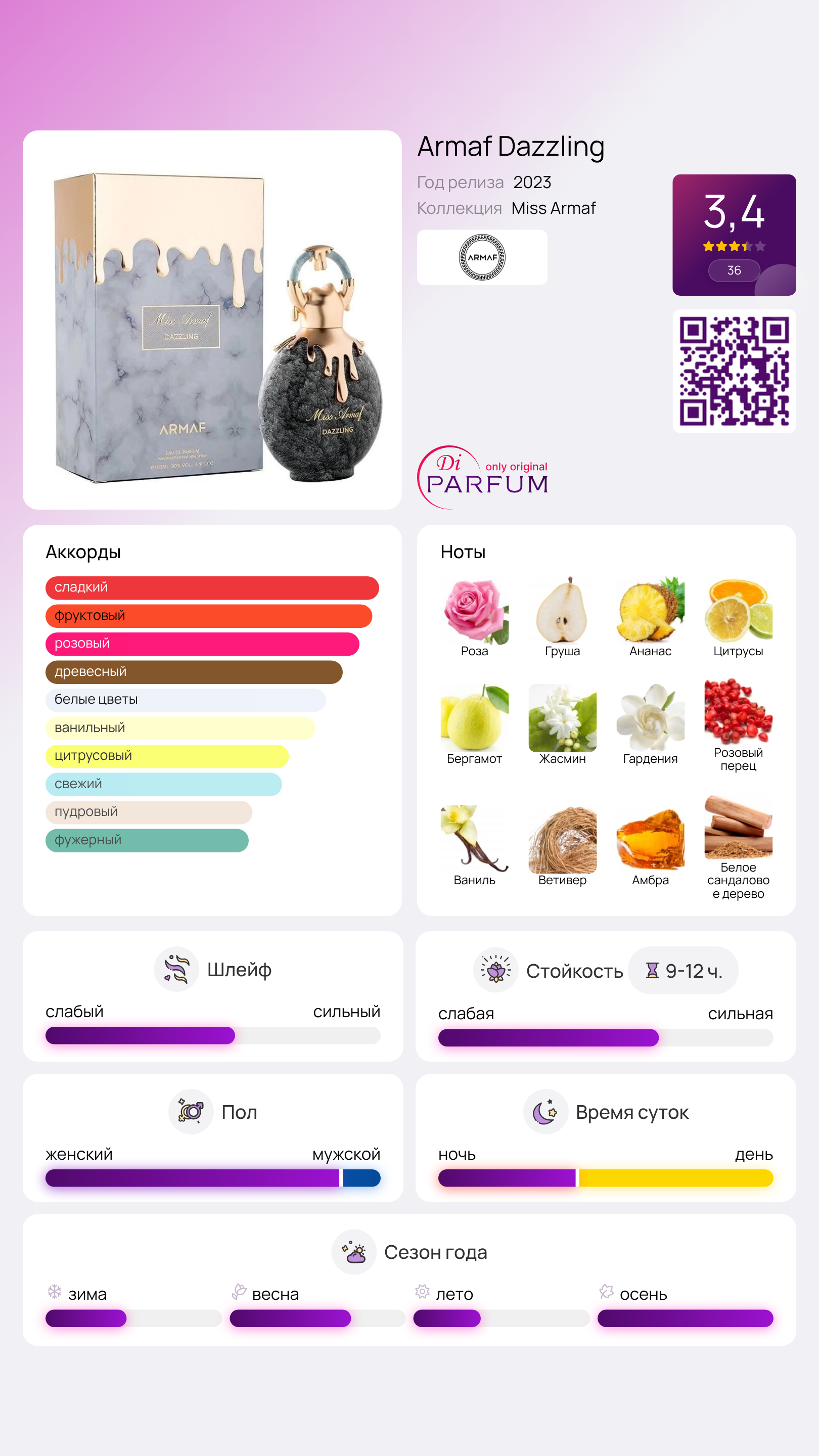 Аромат Dazzling идеально подходит для весенне-летнего времени и станет отличным выбором для дневных и вечерних мероприятий. Эта композиция будет прекрасным дополнением к вашему образу и привлечет внимание окружающих. Откройте для себя мир ярких ощущений с Dazzling от Armaf!