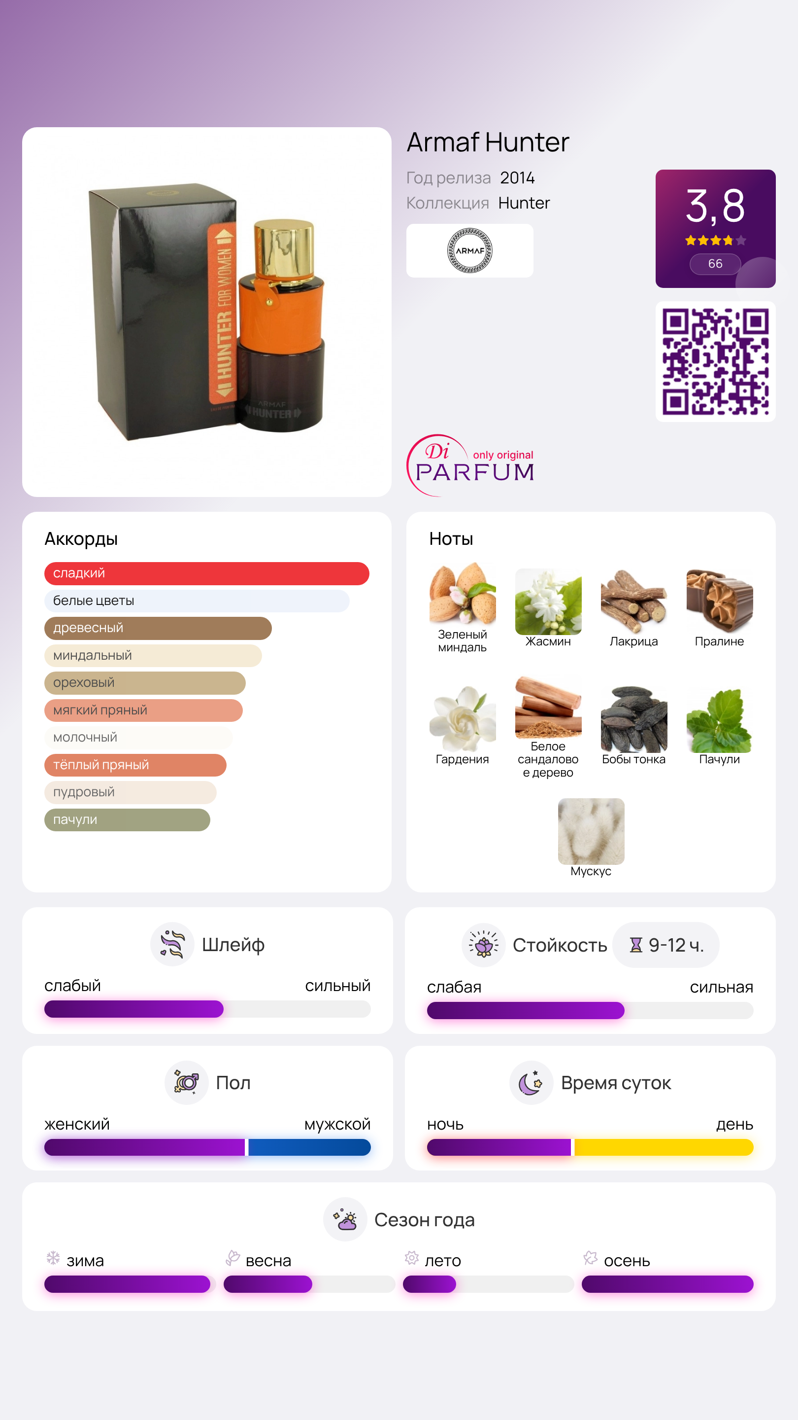 В центре звучания ощущается сладкий, соблазнительный аромат пралине, смешанный с лакрицей, под которым царит обволакивающее благоухание бутонов гардении. Завершающая нота этого очаровательного коктейля – чувственный мускусный шлейф, в котором гармонично сочетаются землистые пачули и дымные бобы тонка, создавая единый аккорд с мягкой, сливочной нотой сандала. Armaf Hunter поможет вам стать яркой, уверенной и соблазнительной женщиной, перед чарами которой любой мужчина будет беззащитен.