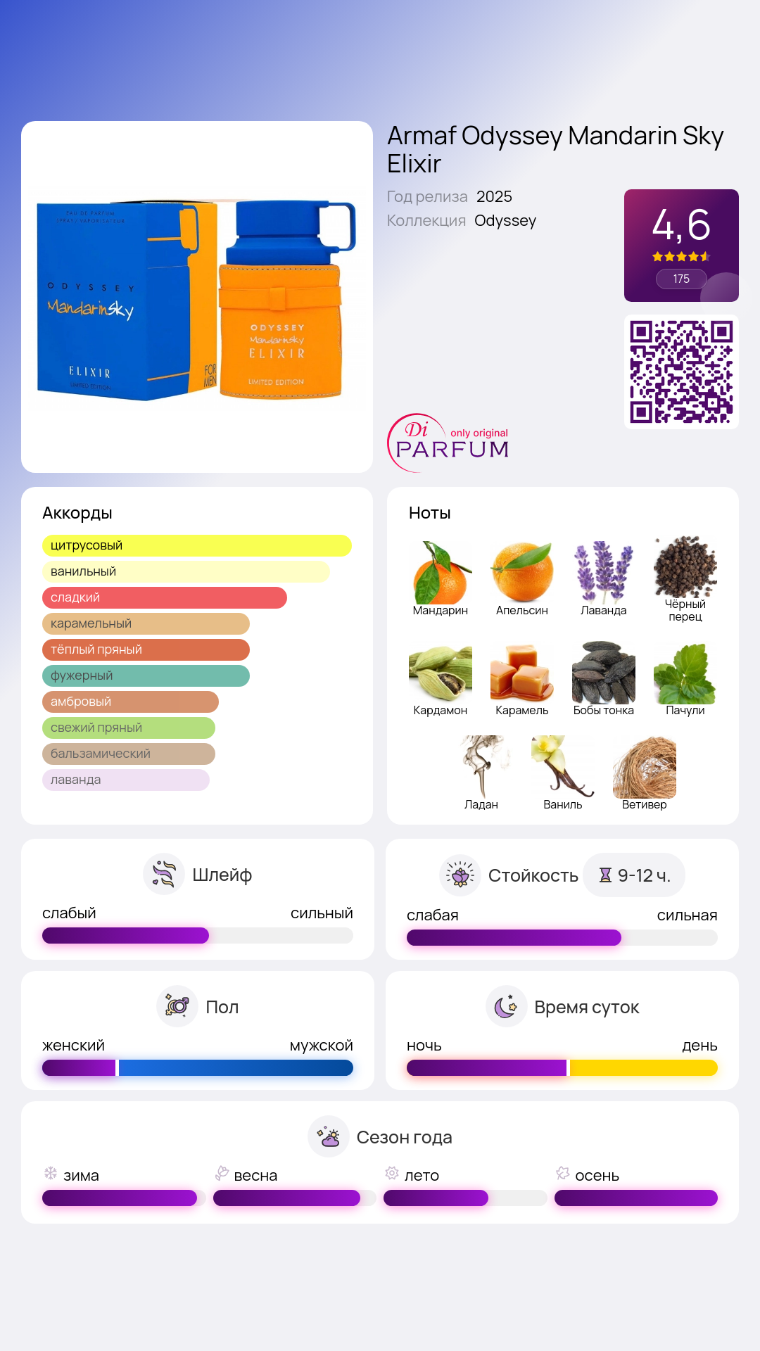 Mandarin Sky Elixir – это поистине унисекс аромат, который соединяет яркость и тайну, сладость и дымку. Он создан для тех, кто уверенно движется между мирами, оставляя за собой загадочный след.