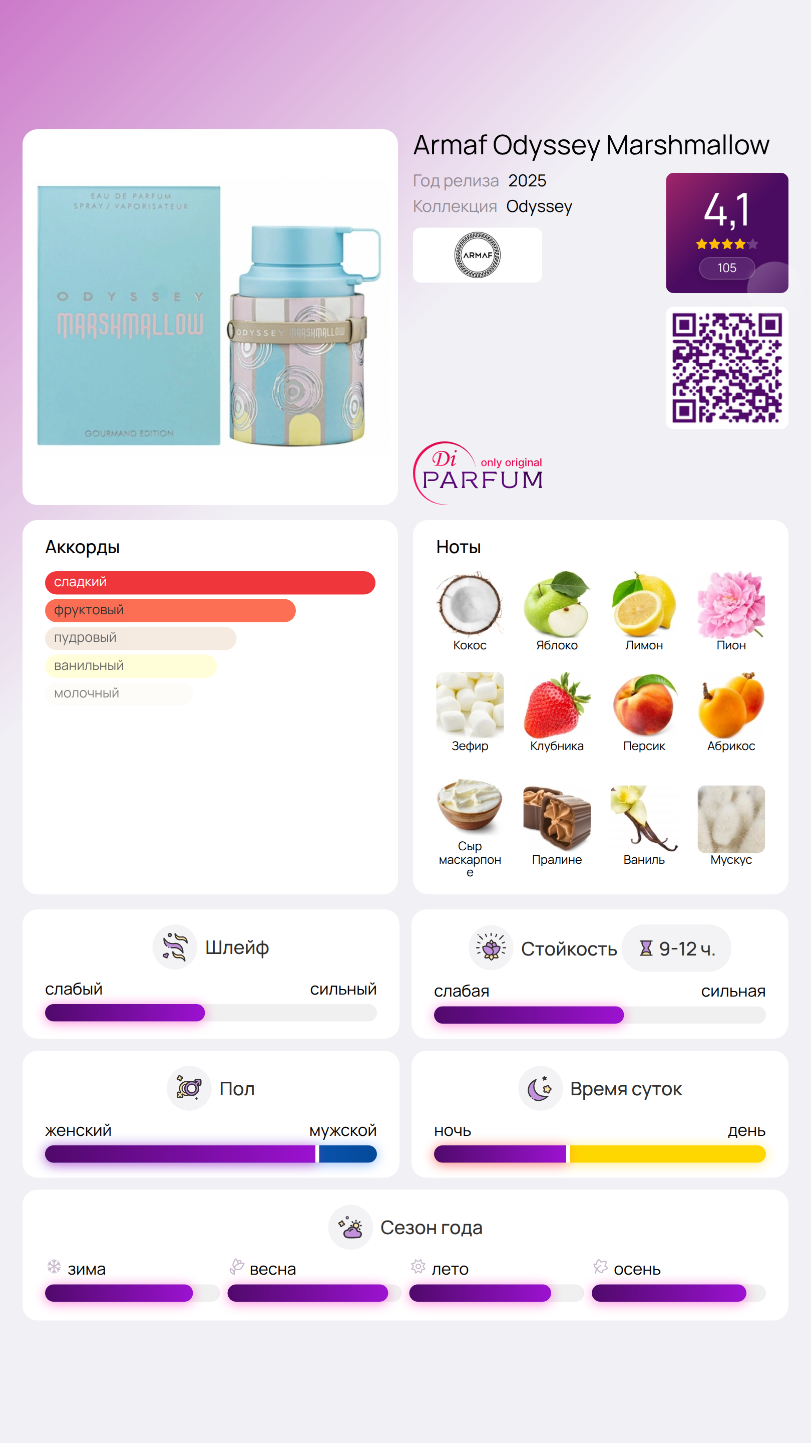 кокос, яблоко, лимон, пион, ландыш, маршмеллоу, клубника, персик, абрикос, малина, цветок апельсина, сыр маскарпоне, пралине, ваниль, мускус, бобы тонка, амбра