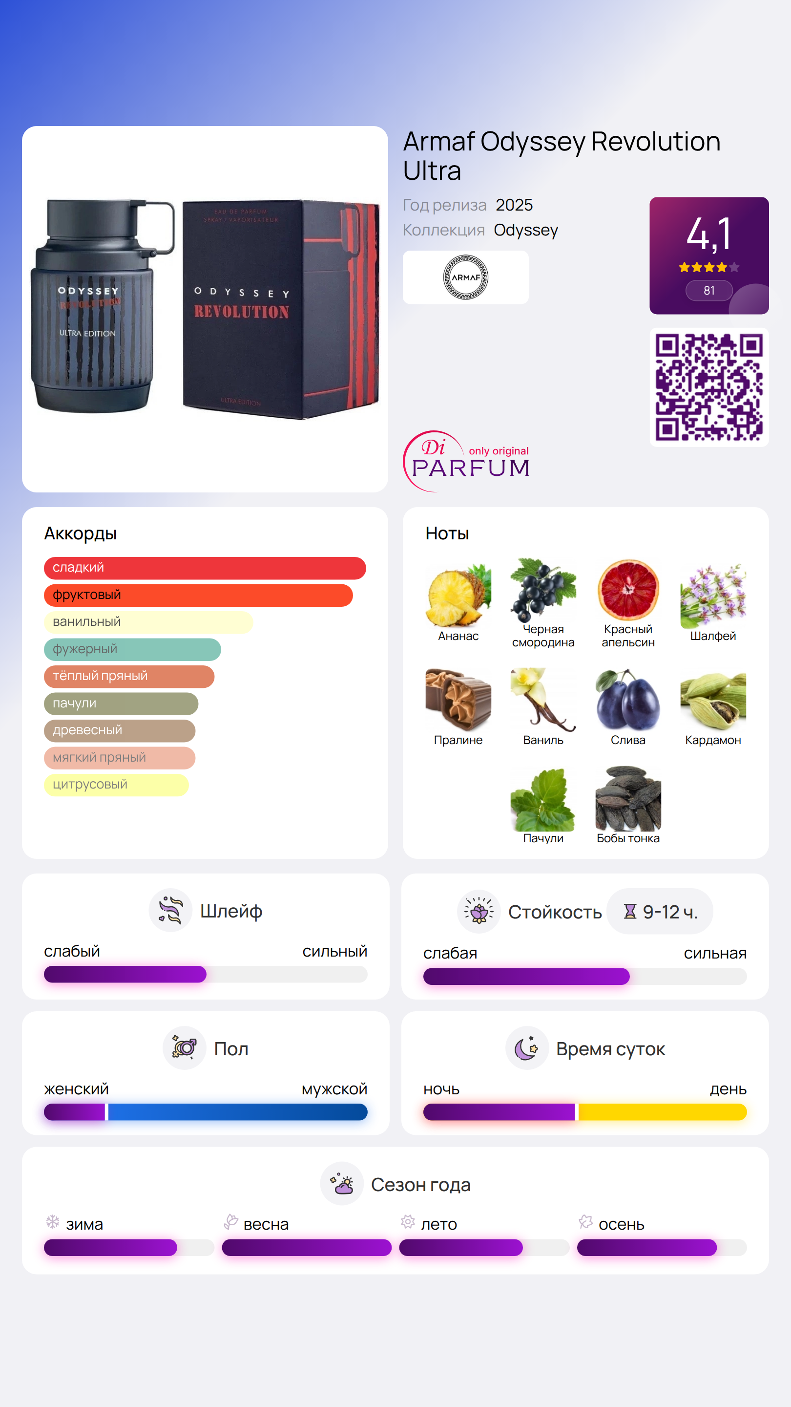 Odyssey Revolution от Armaf – это ароматная фруктовая композиция, предназначенная как для женщин, так и для мужчин. Этот новый парфюм был выпущен в 2025 году и уже успел завоевать популярность благодаря своей оригинальной задумке и свежему звучанию. Верхние ноты включают ананас, черную смородину, красный апельсин и шалфей, создавая яркий и фруктовый старт. В сердце композиции скрываются пралине, ваниль, слива и кардамон, что добавляет глубину и сладость. Завершают аромат базовые ноты пачули и бобы тонка, придавая ему стойкость и насыщенность.