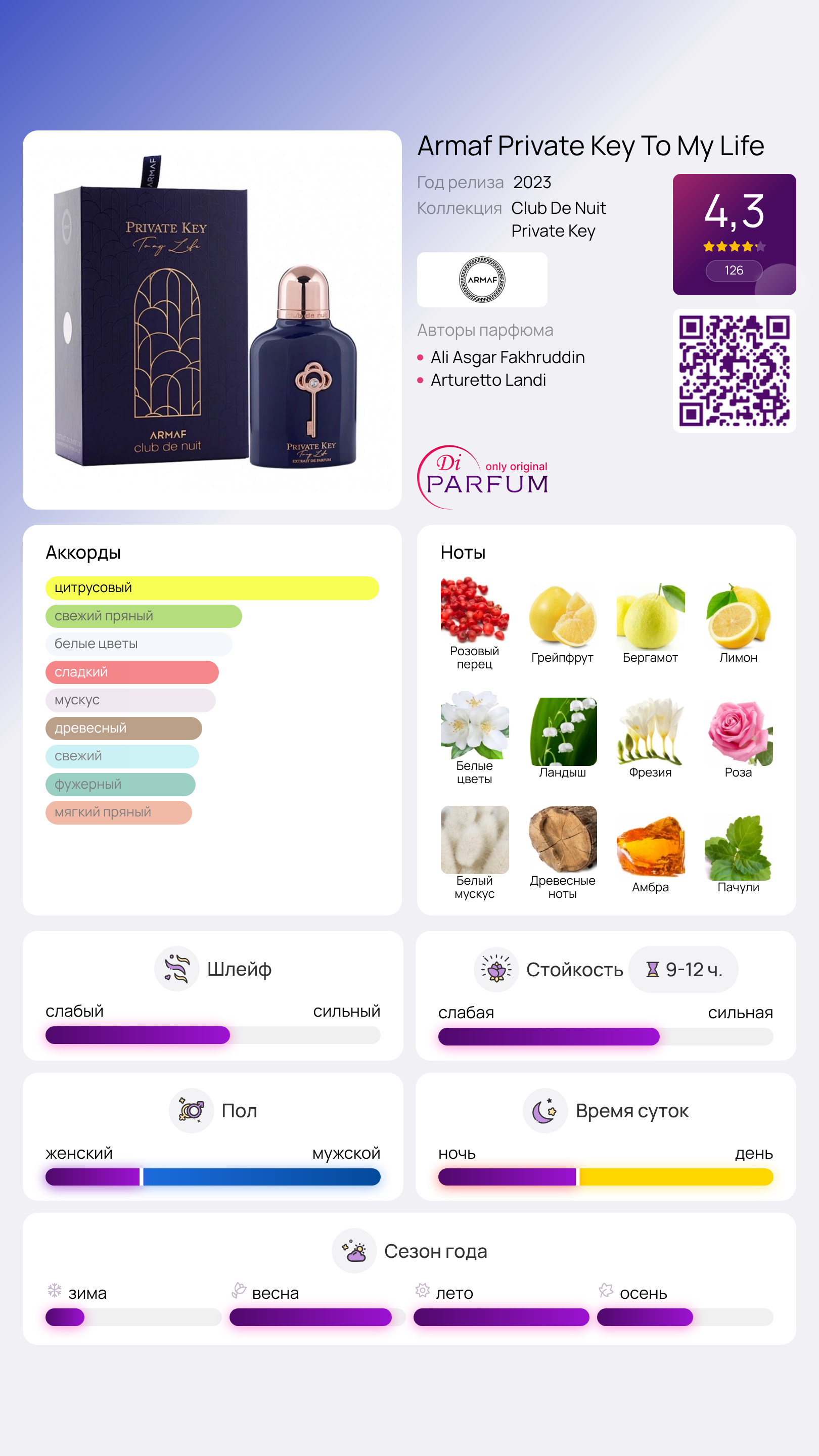 Новая ароматическая линия Private Key от восточного парфюмерного бренда из Объединенных Арабских Эмиратов Armaf призвана помочь найти тот самый ключ, который откроет двери к успеху во всех сферах жизни. Унисекс-аромат Private Key To My Life служит разгадкой, способной разжечь ваш внутренний огонь и представить новые жизненные горизонты. Создателями этого произведения стали Али Асгар Фагруддин и Артуретто Ланди.