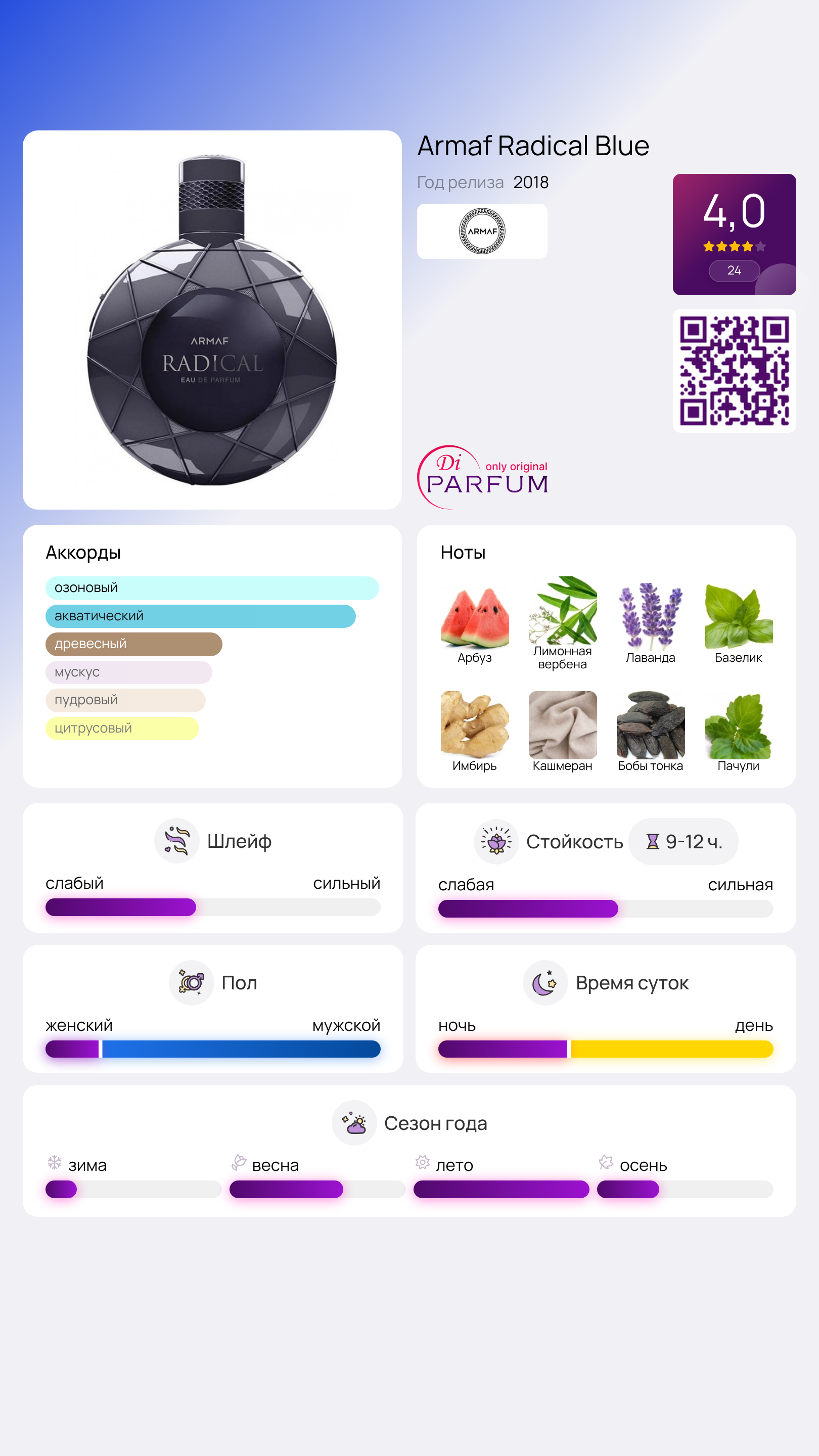 Композиция Radical Blue от Armaf заряжает энергией и позитивом на целый день, вне зависимости от времени года. Элегантный флакон приглушенного серого цвета гармонирует с названием «Радикальный Синий». Черная вставка в центре подчеркивает сдержанный аристократизм. Этот бодрящий парфюм был представлен знаменитым брендом из ОАЭ в 2018 году.