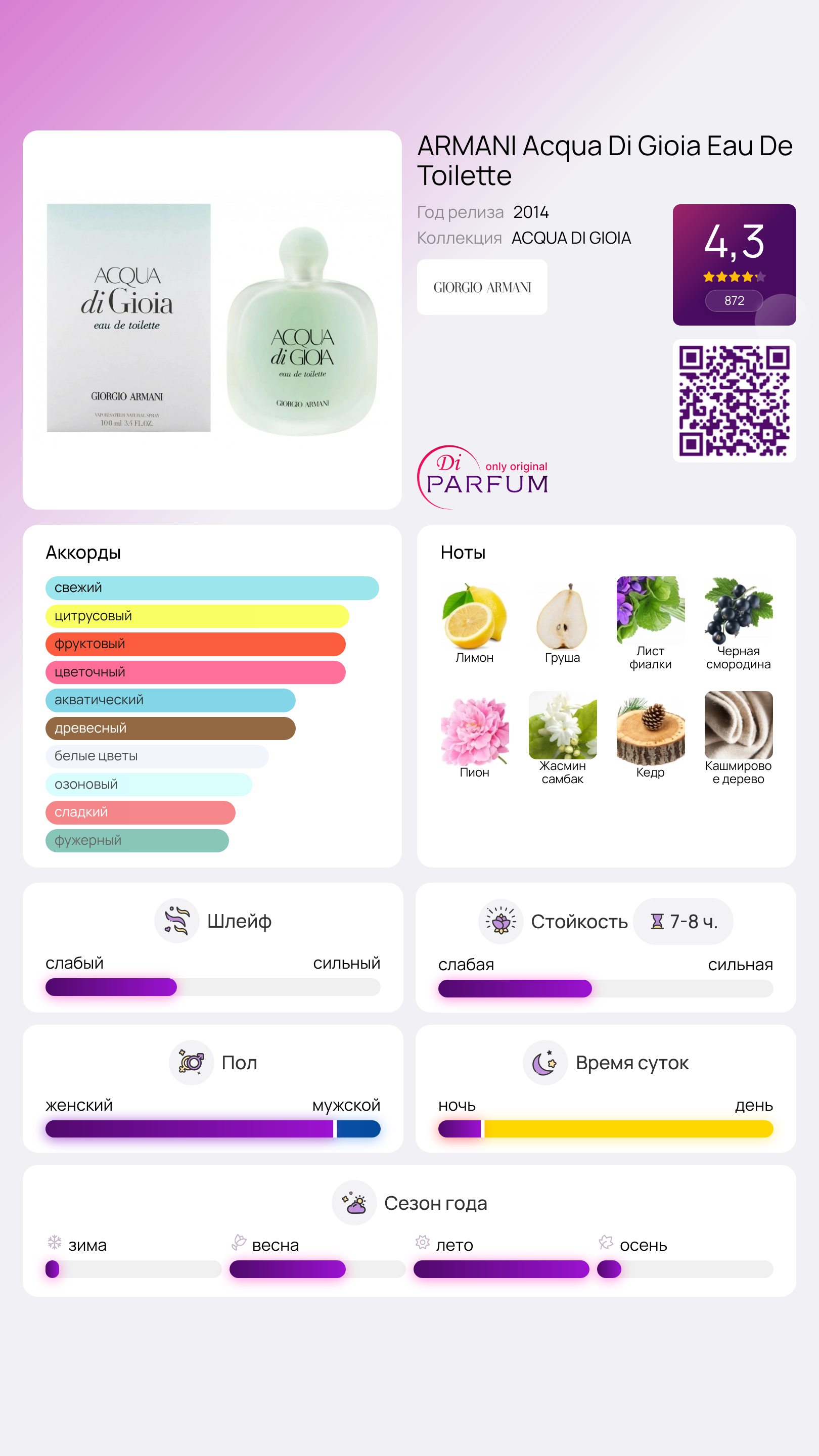 Композиция ARMANI Acqua Di Gioia Eau De Toilette представляет собой «живую» цветочную интерпретацию акватической темы, с легким и современным звучанием. Этот аромат служит не только для освежения, но и способен поднять настроение, сочетая в себе элементы детокса и свежести.
