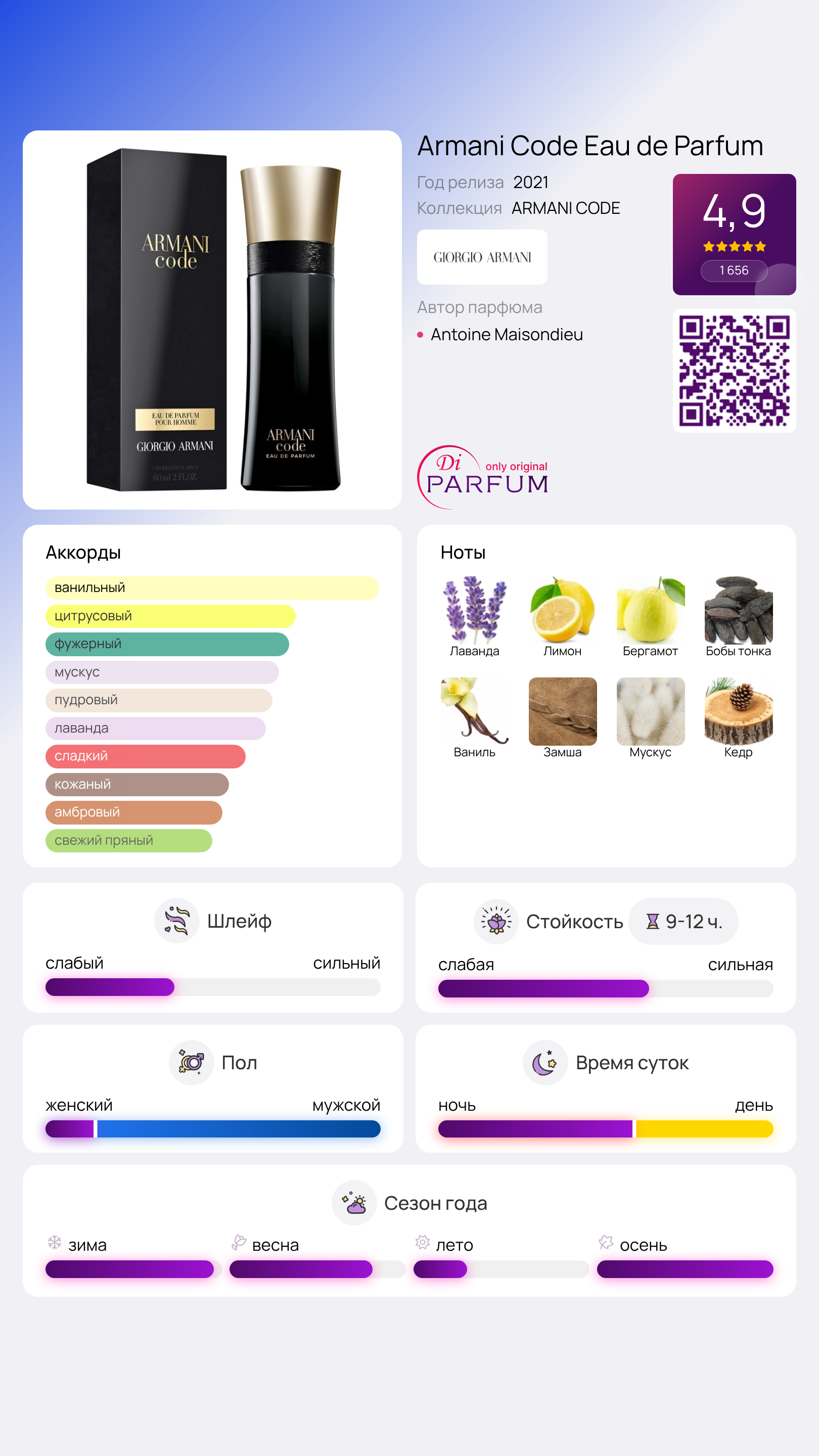 Armani Code Eau de Parfum представляет собой великолепный фужерно-восточный аромат, который раскрывает секреты искусства утонченного соблазнения. Этот парфюм вдохновлен образом мужчины, обладающего естественным магнетизмом, способного привлечь женские сердца без лишних провокаций, предпочитающего подлинные и искренние чувства.