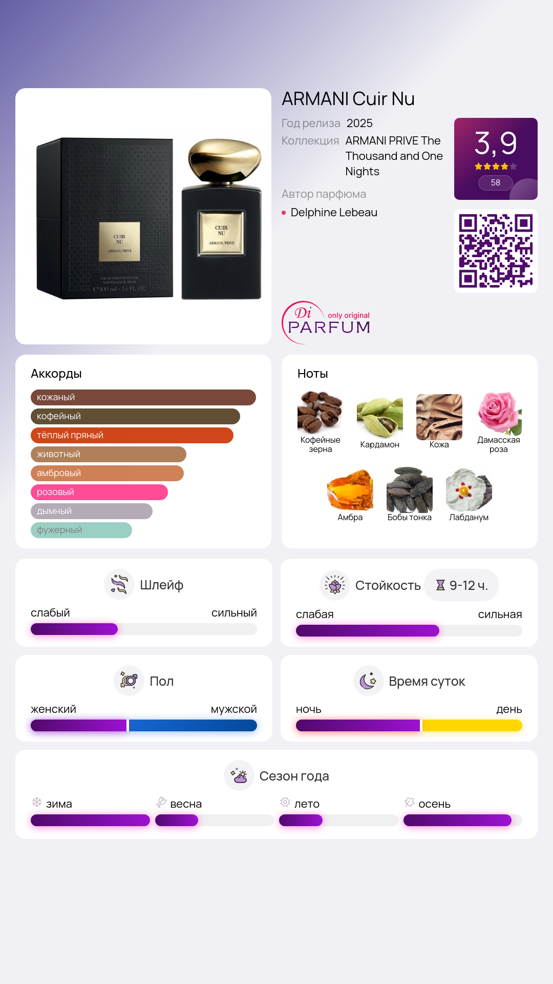 Cuir Nu — это уникальное сочетание восточного и западного влияний, что делает его идеальным для тех, кто ценит утонченность и элегантность. Этот парфюм идеально подходит для вечерних выходов и особых случаев, подчеркивая индивидуальность и стиль своего обладателя.
