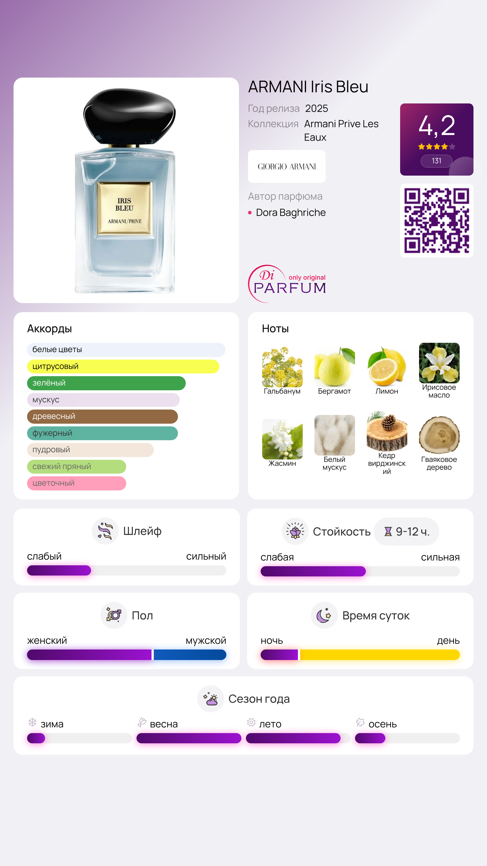Основные ноты аромата включают в себя свежесть гальбанума, яркость бергамота и лимона, которые создают бодрящее начало. Сердце композиции раскрывается нежными оттенками масла ириса и жасмина, внося в аромат чувственность и утонченность. Завершают ощущение белый мускус, виргинский кедр и гваяк, придавая стойкость и глубину этому великолепному произведению искусства.