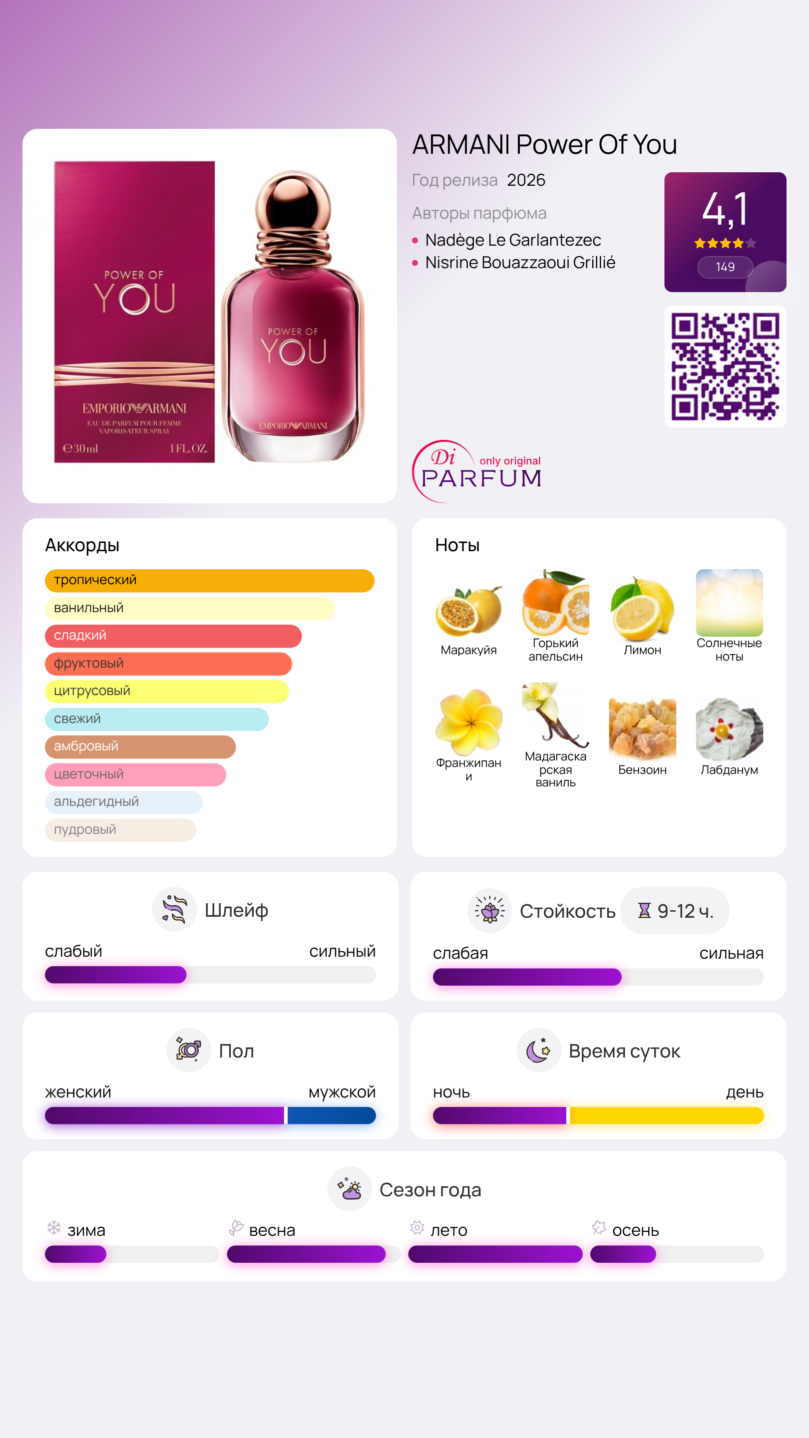 Power Of You от Giorgio Armani - это новый цветочно-фруктово-гурманский аромат для женщин, который был представлен в 2026 году. Этот парфюм стал результатом творческой работы талантливых парфюмеров Нисрин Буаццауи Грилли и Надеж Гarlantezec.