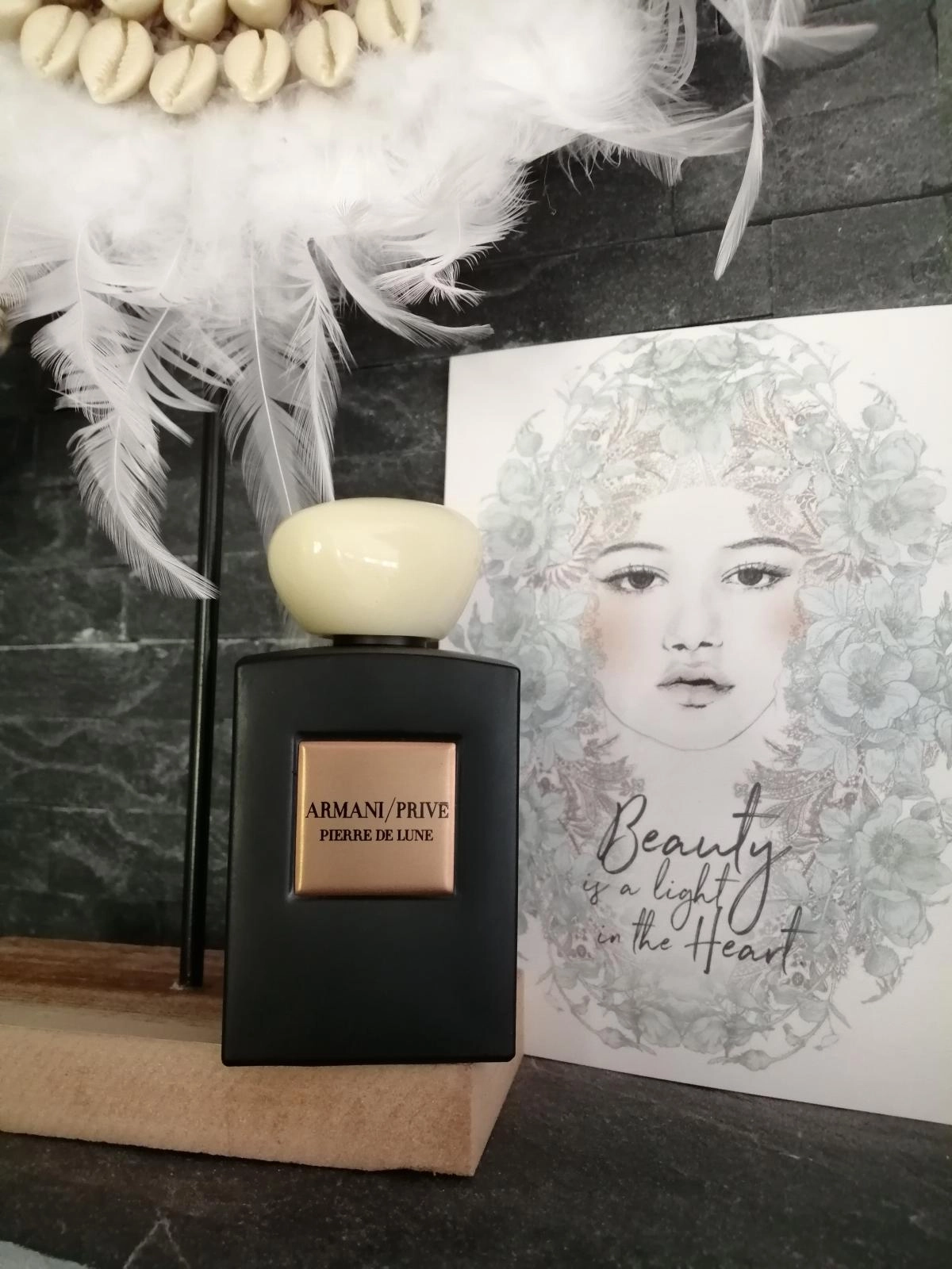 Парфюмы представлены в роскошных флаконах, изготовленных из африканского дерева котибе и с крышками из камня. Prive Pierre de Lune от Giorgio Armani очаровывает своей тонкой нежностью и завораживающим ароматом, который изящно сочетает свежие травянистые ноты, такие как ирис, цветочный бальзам, фиалка и амбра.