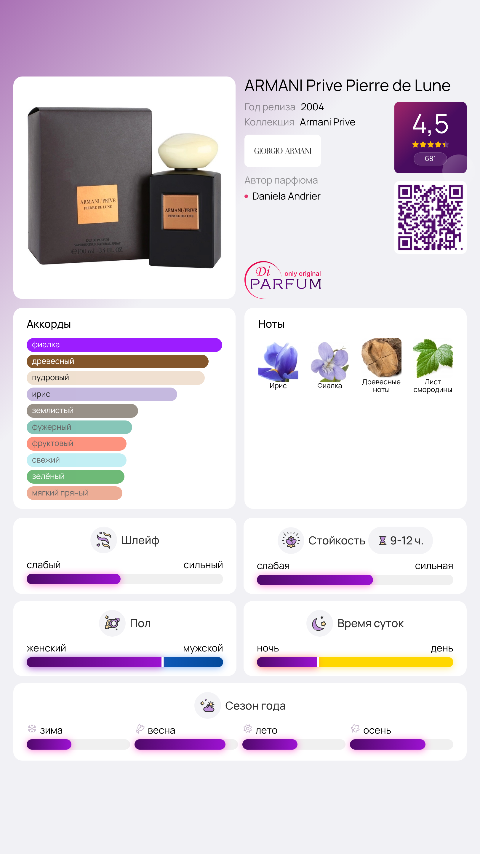 Парфюмы представлены в роскошных флаконах, изготовленных из африканского дерева котибе и с крышками из камня. Prive Pierre de Lune от Giorgio Armani очаровывает своей тонкой нежностью и завораживающим ароматом, который изящно сочетает свежие травянистые ноты, такие как ирис, цветочный бальзам, фиалка и амбра.