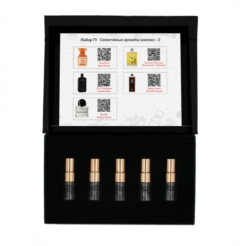 В набор AromaBox под названием «Набор №73: Селективные ароматы-унисекс – 2» представлены пять различных композиций от известных брендов, таких как Tom Ford, 27 87 Perfumes, BYREDO, Escentric Molecules и Serge Lutens. Небольшие пробники объемом 2 мл позволят вам ознакомиться с уникальными запахами без необходимости приобретать полноценные флаконы. Эти ароматы следует рассматривать не в контексте модных тенденций, а с точки зрения их исключительности.