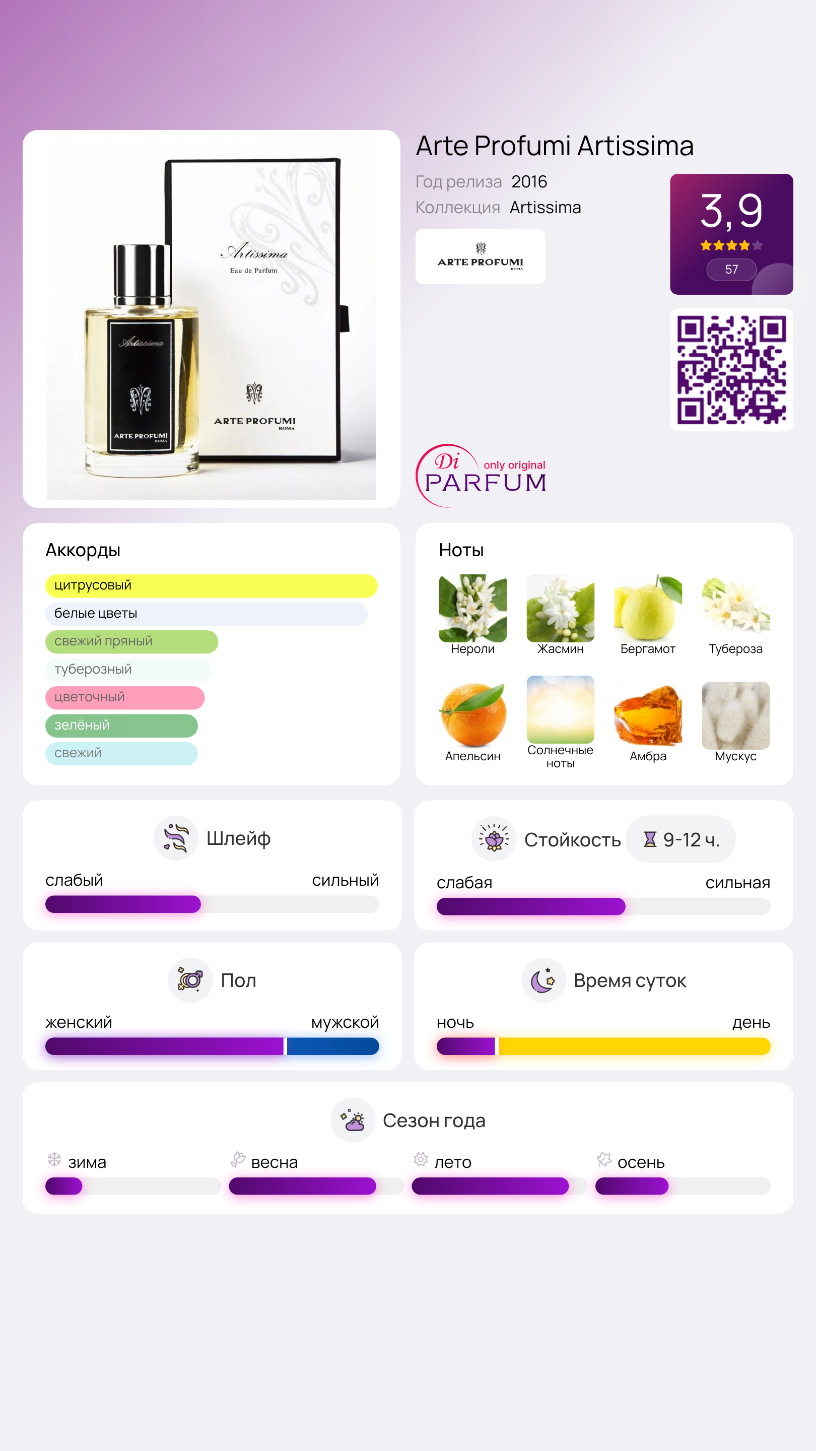 Arte Profumi Artissima является одной из четырех унисекс-композиций, которые вошли в серию «Artissima Collection», представленную в 2016 году молодым итальянским брендом «Арте Парфюм», специализирующимся на нишевой парфюмерии.