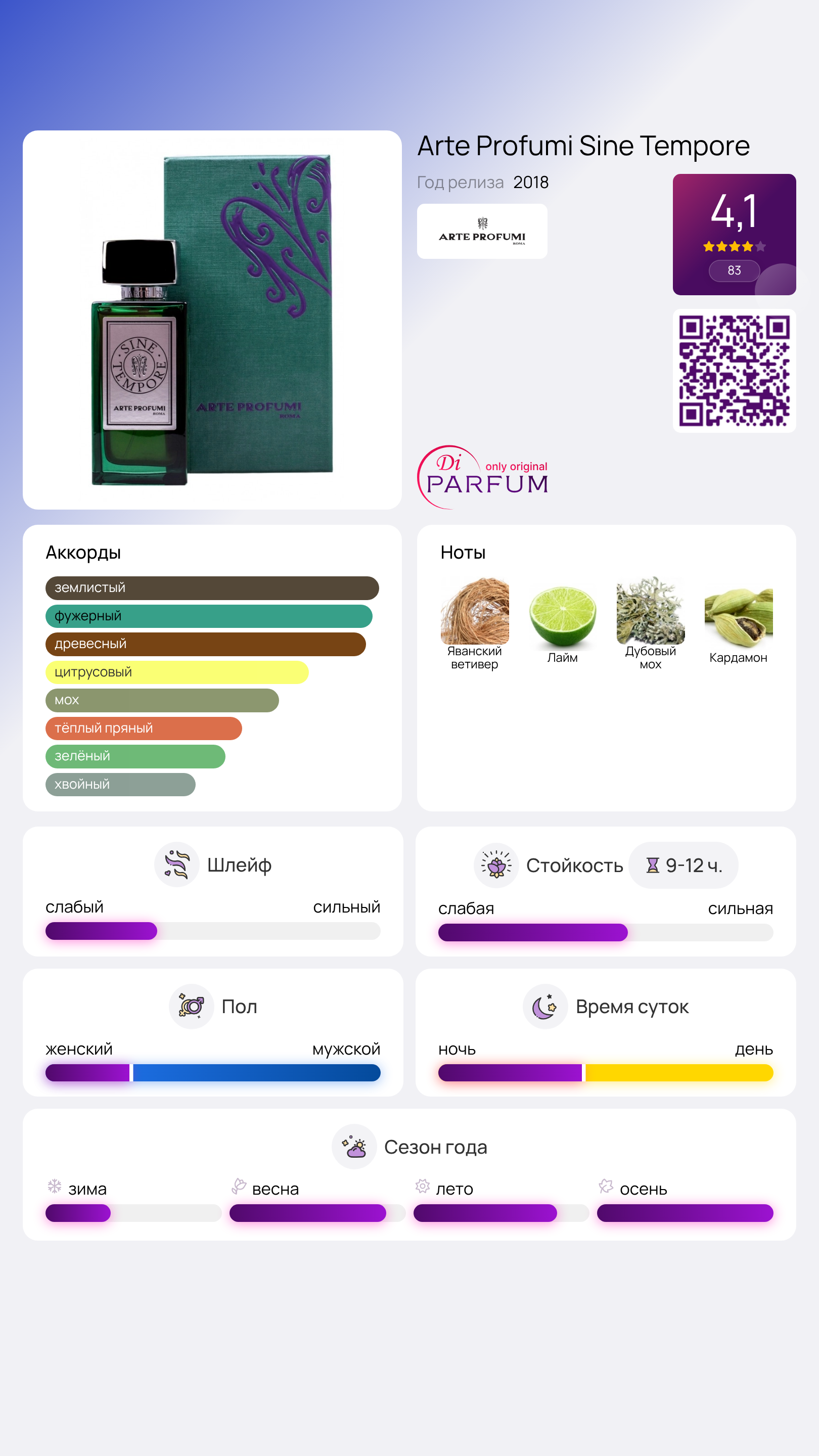 Эта композиция напоминает о натуральном, струящемся шелке. Аромат Sine Tempore был представлен итальянским брендом в 2018 году на выставке Pitti Fragranze во Флоренции и отличается сдержанным и глубоким звучанием, подходящим для уверенных в себе людей. Изящные грани изумрудного флакона, обрамленного серебром, прекрасно отражают солнечный свет.